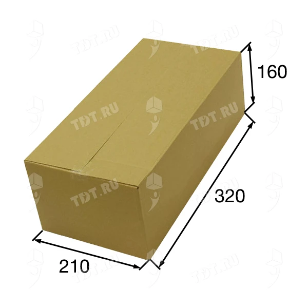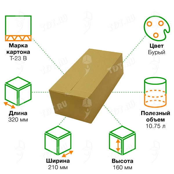 Короб К-158 бурого цвета, длиной 320 мм, шириной 210 мм и высотой 160 мм. Изготовлен из трехслойного картона марки Т-23 В. Полезный объём — 10.75 л.