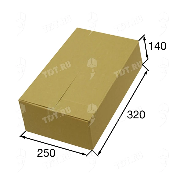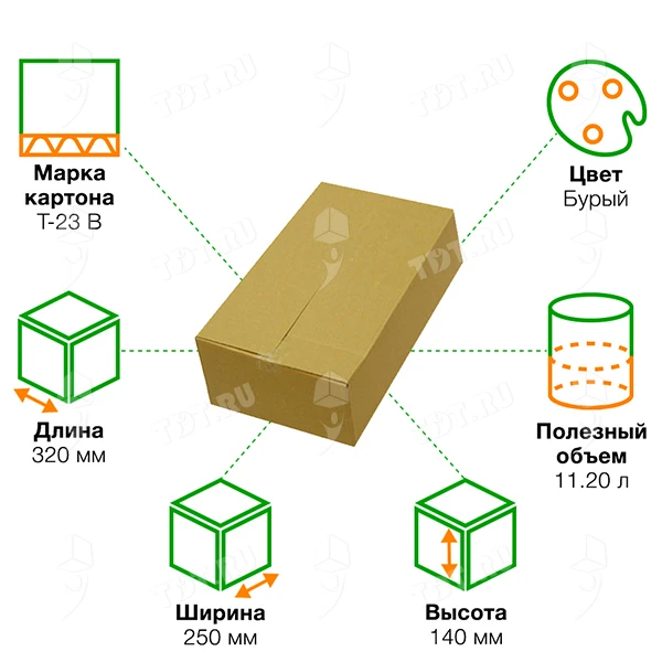 Короб К-181 бурого цвета, длиной 320 мм, шириной 250 мм и высотой 140 мм. Изготовлен из трехслойного картона марки Т-23 В. Полезный объём — 11.20 л.