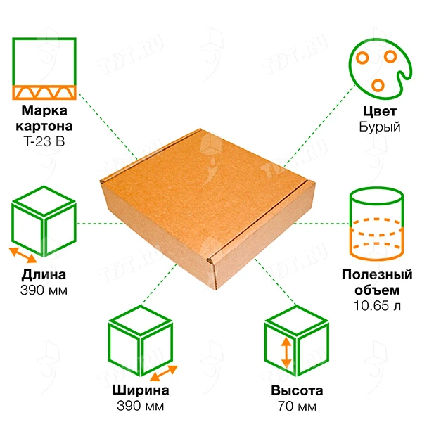 Короб КУ-18 бурый, длиной 390 мм, шириной 390 мм и высотой 70 мм. Изготовлен из трёхслойного картона Т-23 В. Полезный объём — 10.65 л.