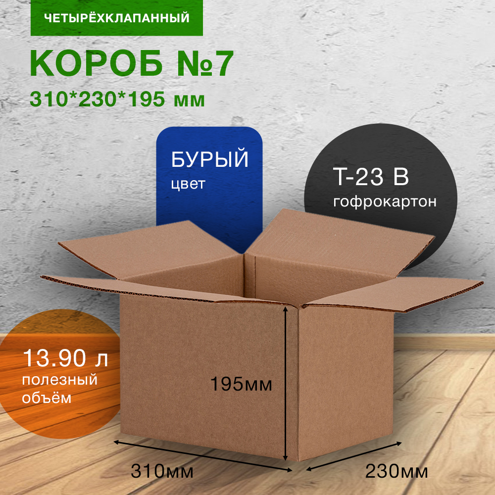 Картонный короб №7 для хранения вещей (маленький), длиной 310 мм, шириной 230 мм и высотой 195 мм. Изготовлен из трехслойного картона марки Т-23 В. Полезный объём — 13.9 л.