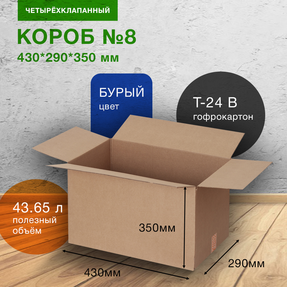 Картонный короб №8 для хранения вещей (стандарт), длиной 430 мм, шириной 290 мм и высотой 350 мм. Изготовлен из трехслойного картона марки Т-24. Полезный объём — 43.65 л.