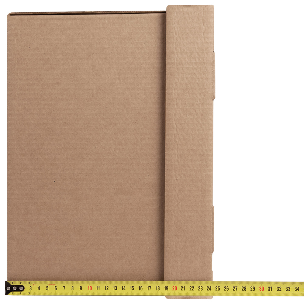 Архивный короб №9 формата А4, длиной 330 мм, шириной 230 мм и высотой 230 мм. Изготовлен из трёхслойного гофрокартона марки Т-24 В. Полезный объём — 17.5 л.