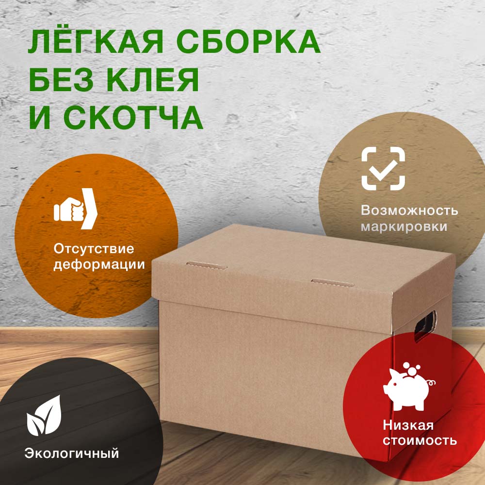 Размерность коробки является универсальной для упаковки большинства вещей. При переезде, например. Быстрый и удобный доступ к содержимому из-за откидываемой крышки. Достаточная прочность для установки их в штабель на паллете. Удобство при переноске (есть ручки). Плоское дно без щелей. Удобно при переноске, погрузке-разгрузке. Входит на большинство полок при хранении. ПРактически идеальный вариант при перевозке.