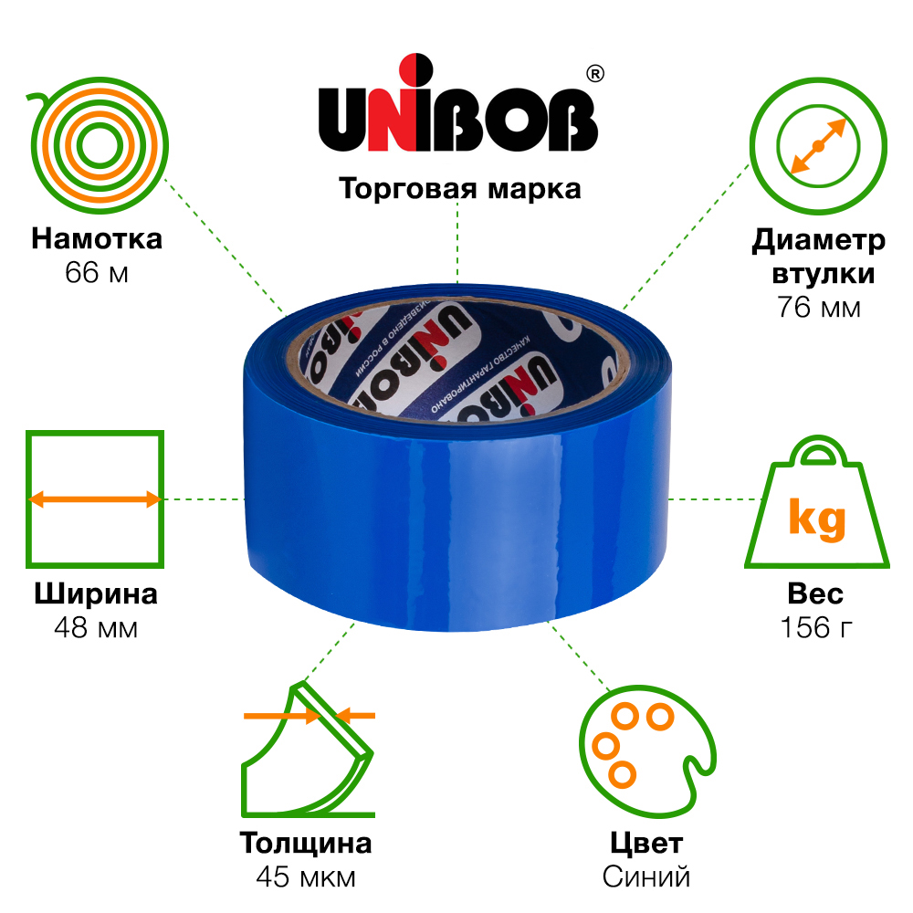 Скотч синего цвета Unibob®, толщиной 48 мм, прекрасно подходит для картона гофрированного и мелованного, надежно крепится к ровным поверхностям и не рвется. Имеет повышенную прочность к растяжениям и большим нагрузкам. Такой скотч виден издалека, привлекая к себе внимание, на складе помечается разный товар, для быстрой ориентации и поиска по цвету.