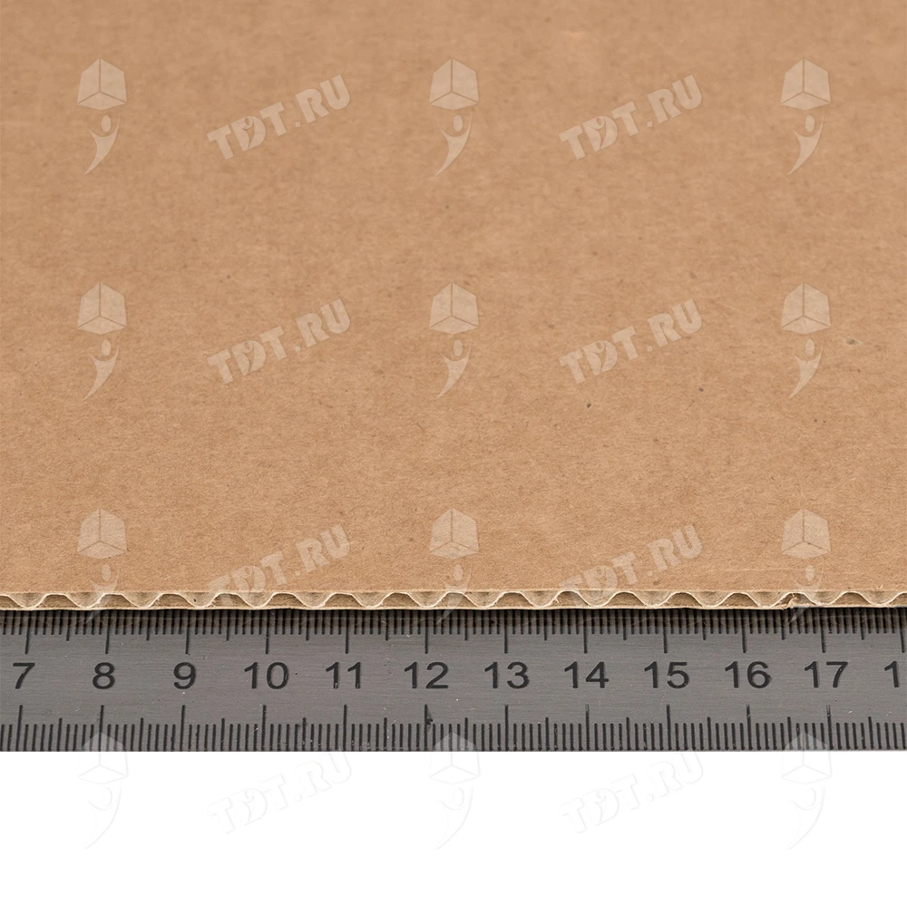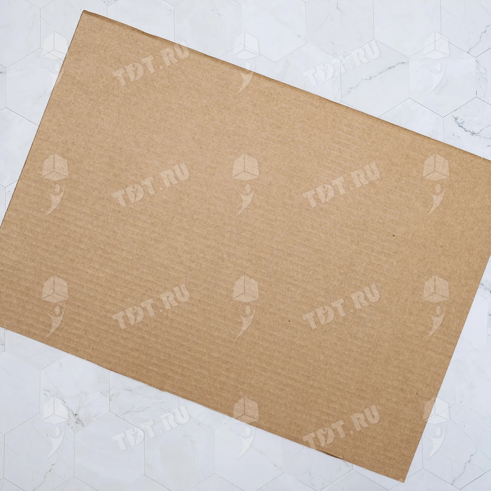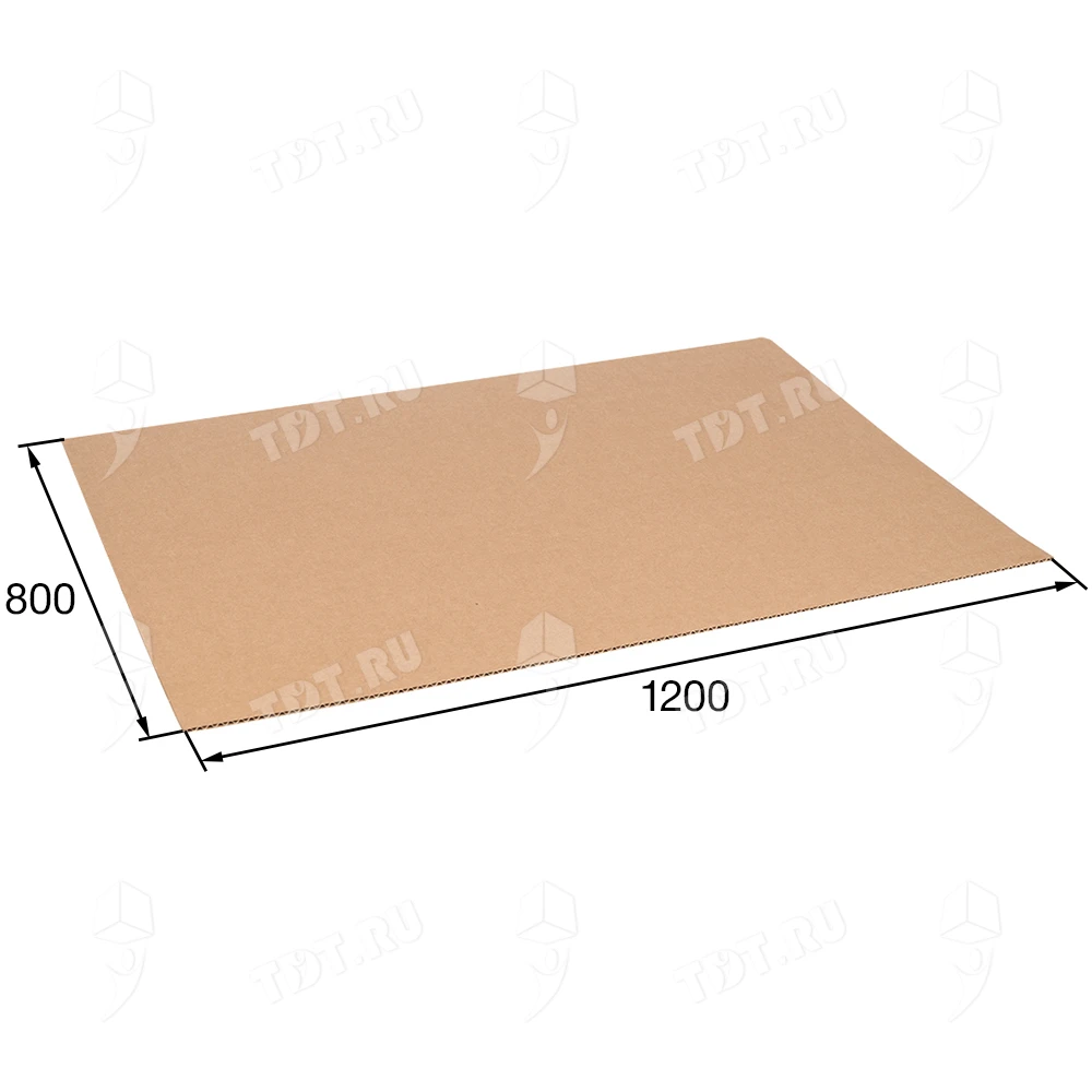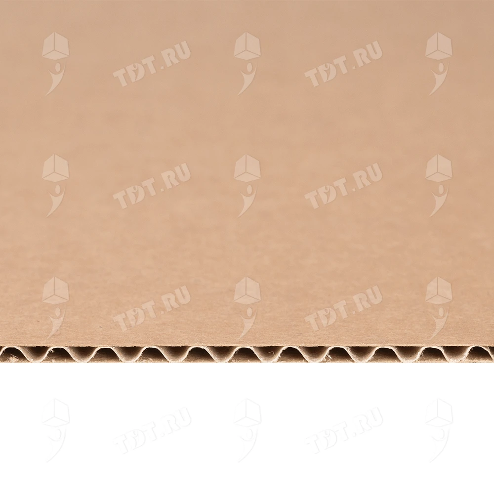 Трехслойный лист гофрокартона, бурого цвета, марки Т-24 В, длиной 1200 мм, шириной 800 мм, толщиной 2.5-3.2 мм, площадью 0.96 м², направление волны вдоль стороны 1200 мм. Для производства листов используется только первичное высококачественное сырье, плотность плоских листов – 160 г/м², плотность гофры – 140 гр./м². Производится в России.