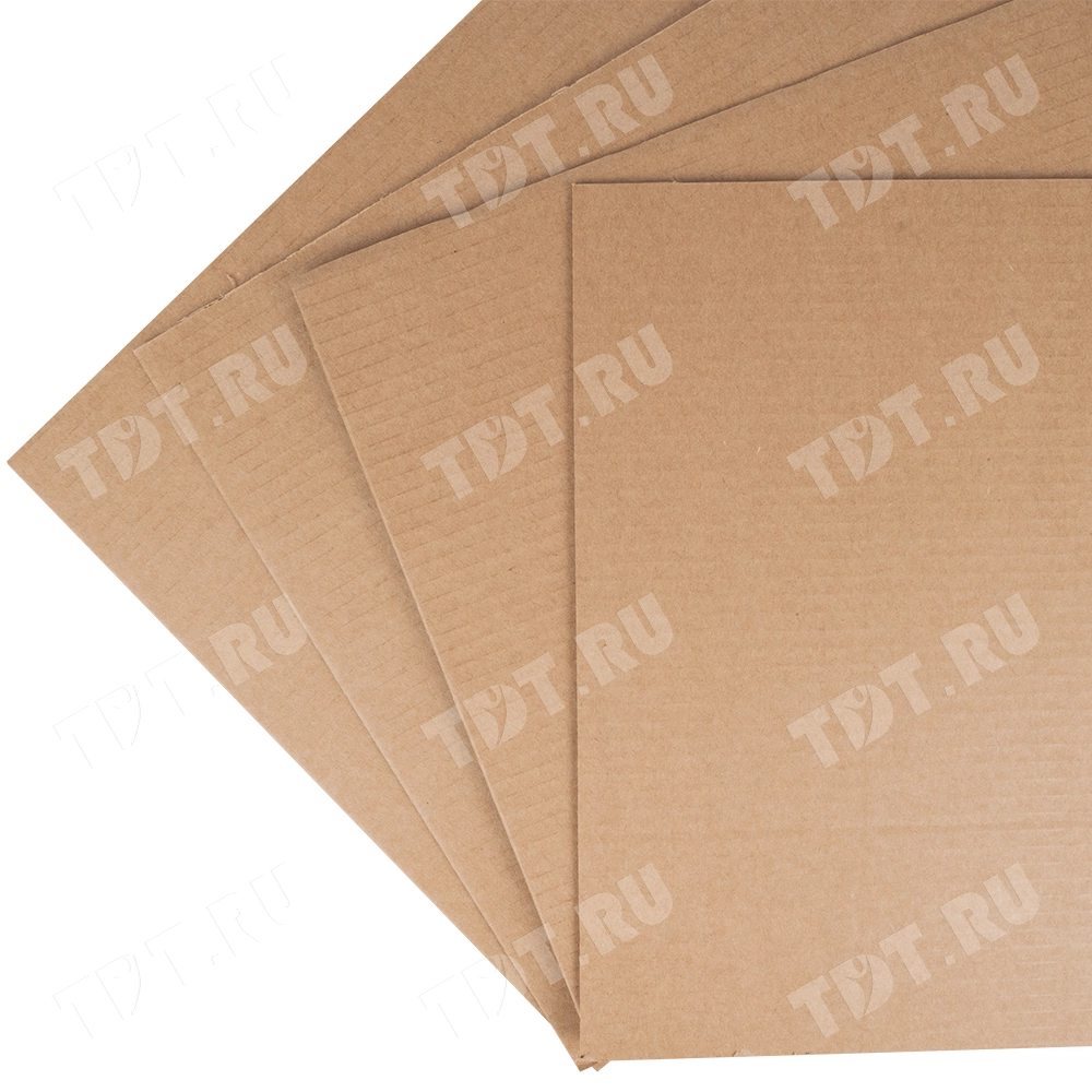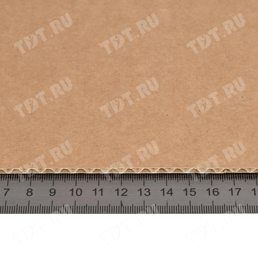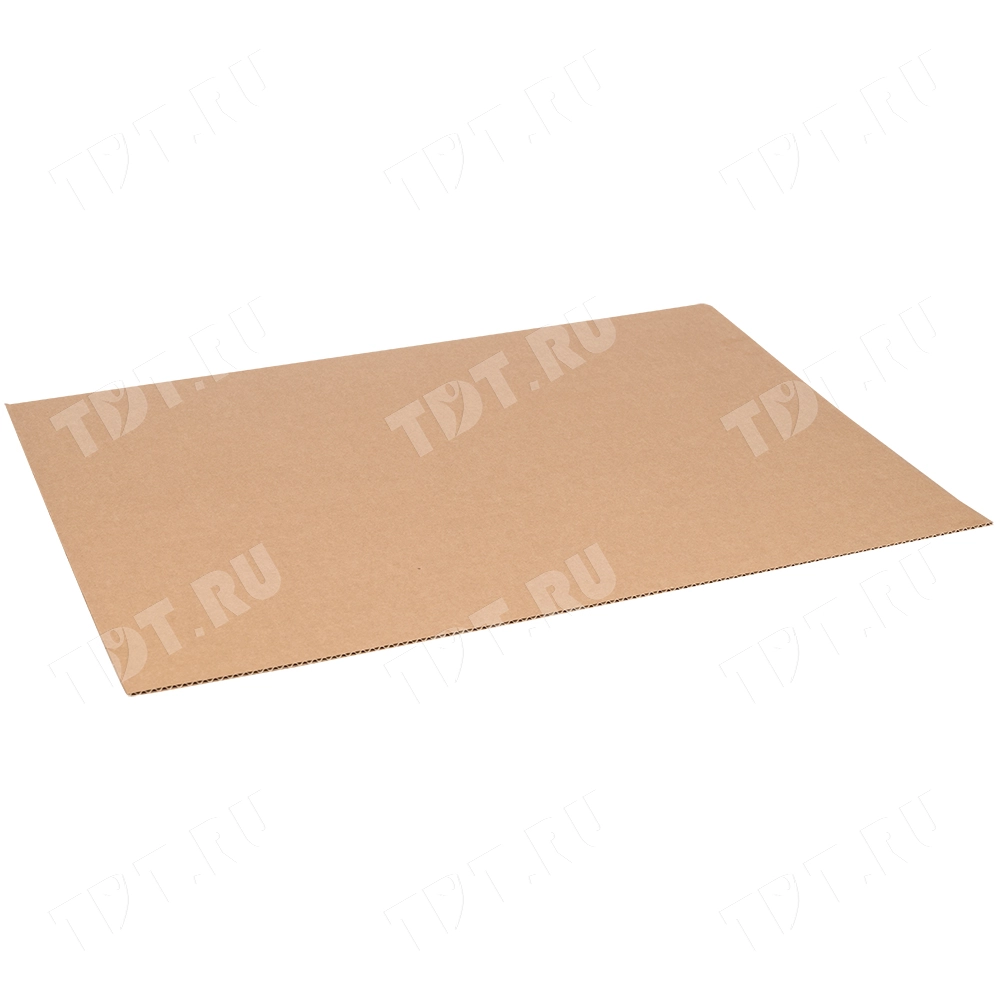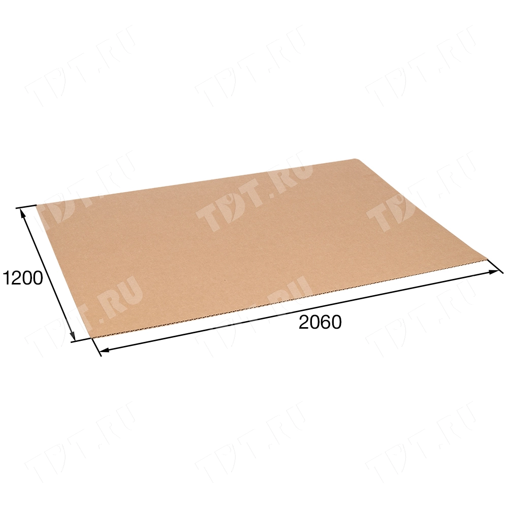 Трехслойный лист гофрокартона, бурого цвета марки Т-21 В, длиной 2060 мм, шириной 1200 мм, толщиной 2.5-3.2 мм, площадью 2.47 м², направление волны вдоль стороны 1200 мм. Производится в России.