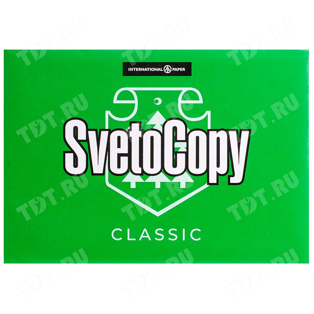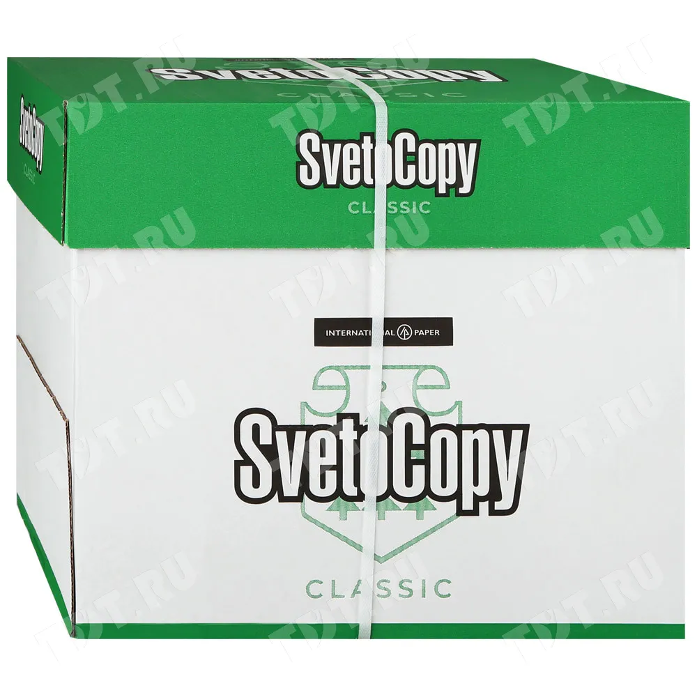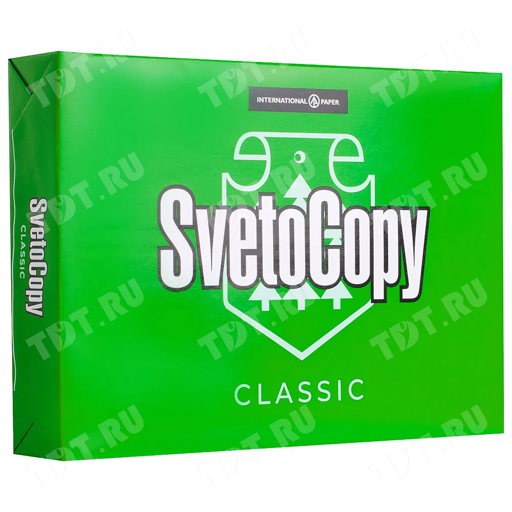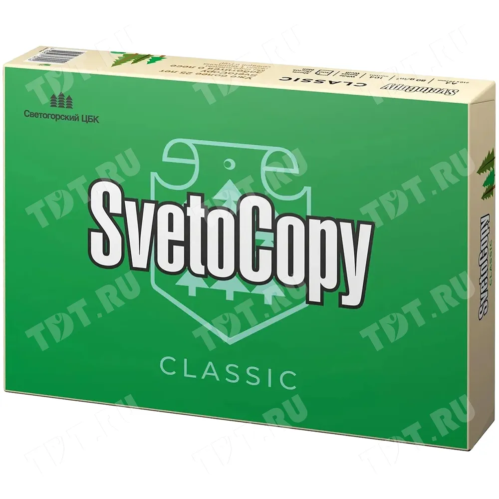 Универсальная офисная бумага SvetoCopy Classic (белого цвета), формата А4, диной 297 мм, шириной 210 мм, классом бумаги C, плотностью бумаги 80 г/м², толщиной 104 мкм, белизной 146%, непрозрачностью 91%, в упаковке по 500 штук, весом 2.456 кг. Производится в России.