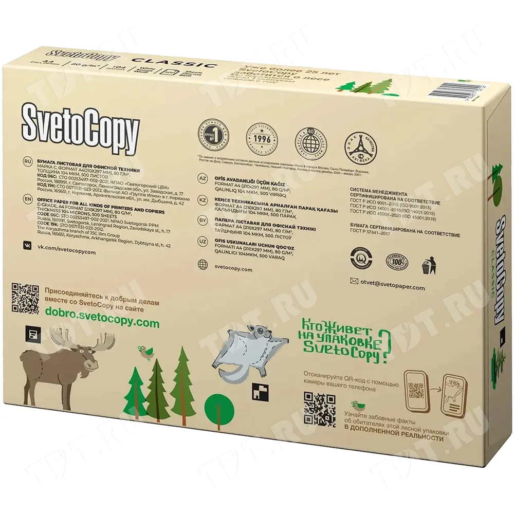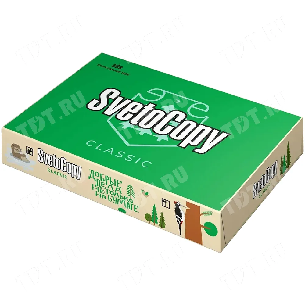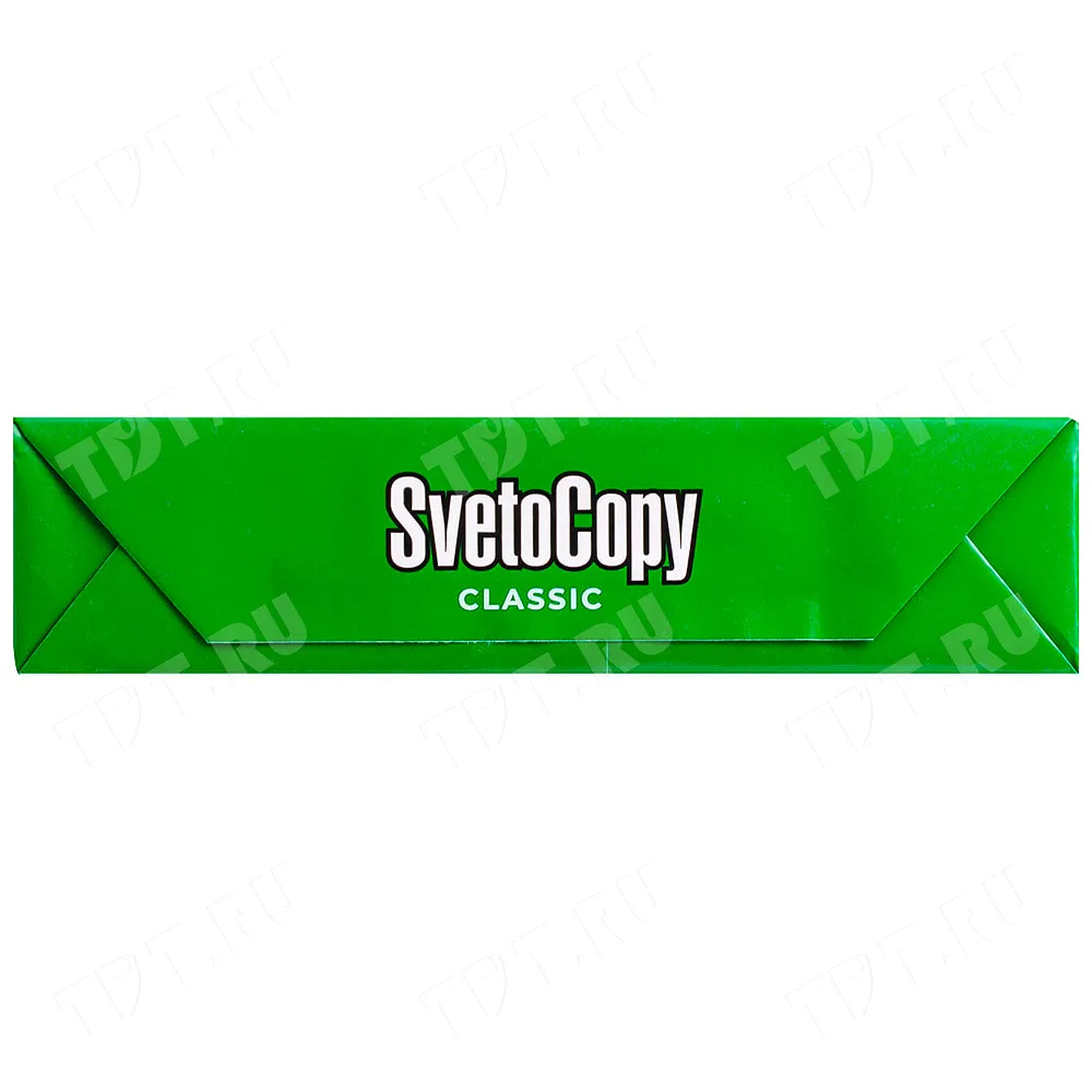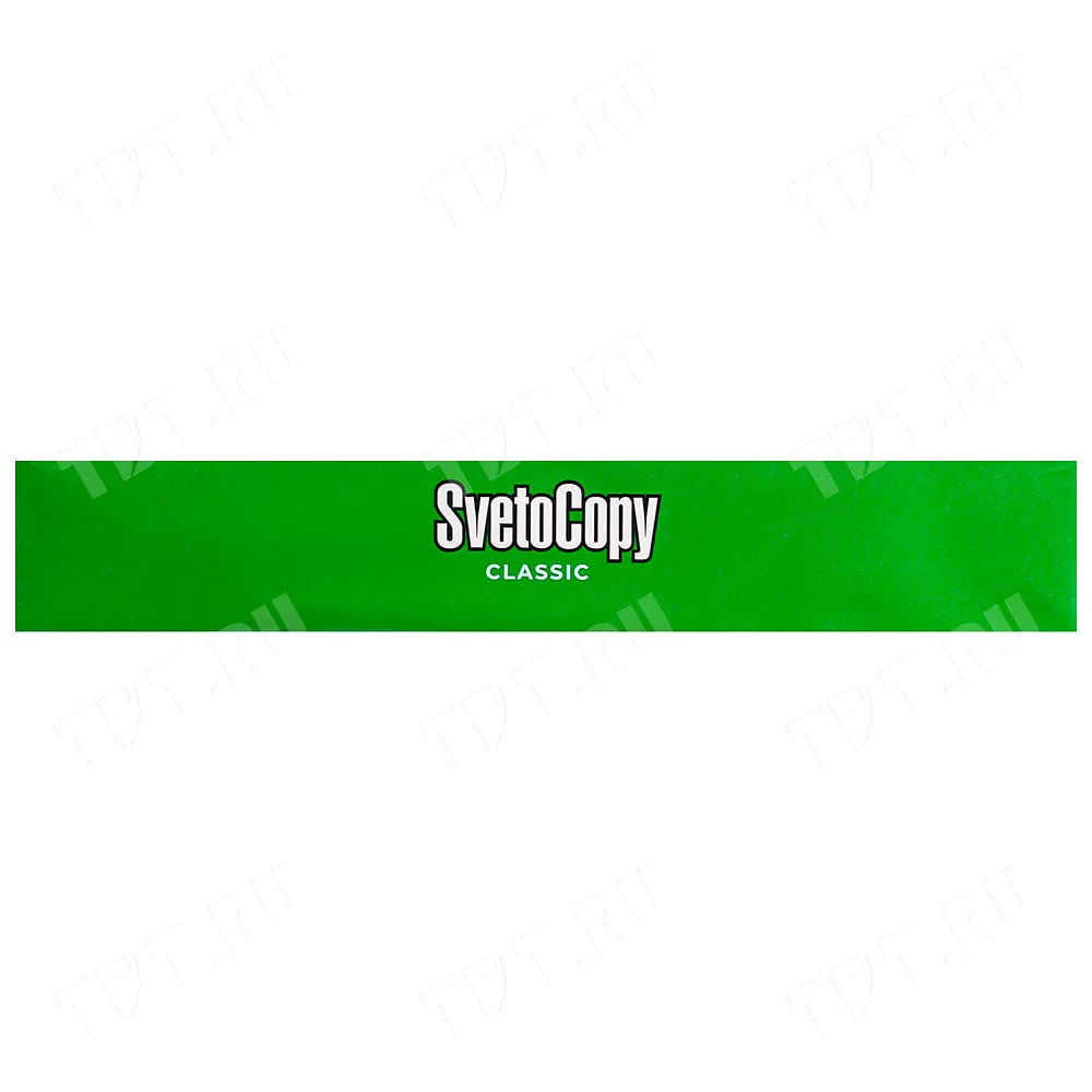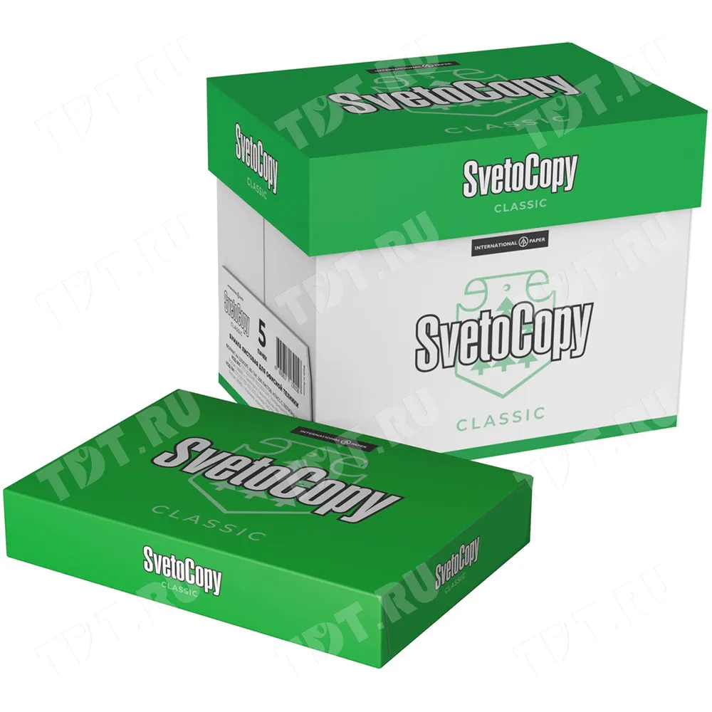 Универсальная офисная бумага SvetoCopy Classic (белого цвета), формата А4, диной 297 мм, шириной 210 мм, классом бумаги C, плотностью бумаги 80 г/м², толщиной 104 мкм, белизной 146%, непрозрачностью 91%, в упаковке по 500 штук, весом 2.456 кг. Производится в России.