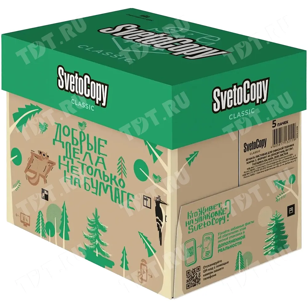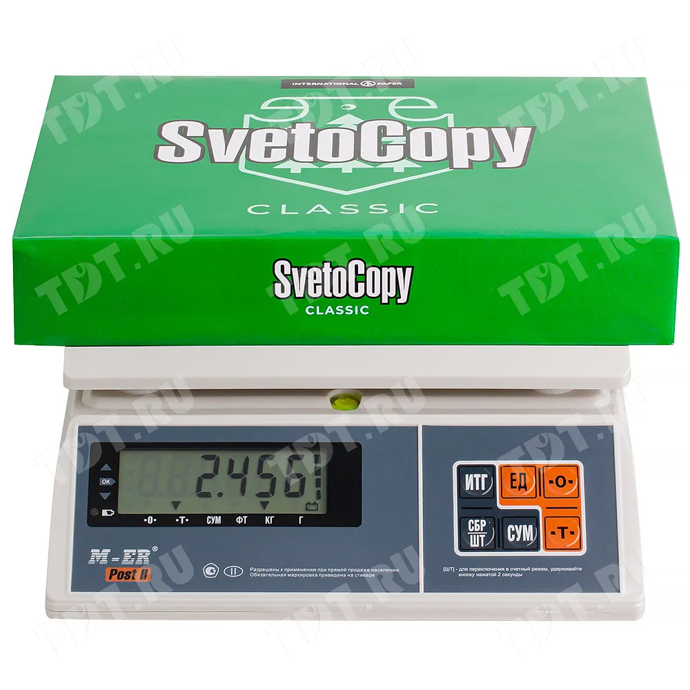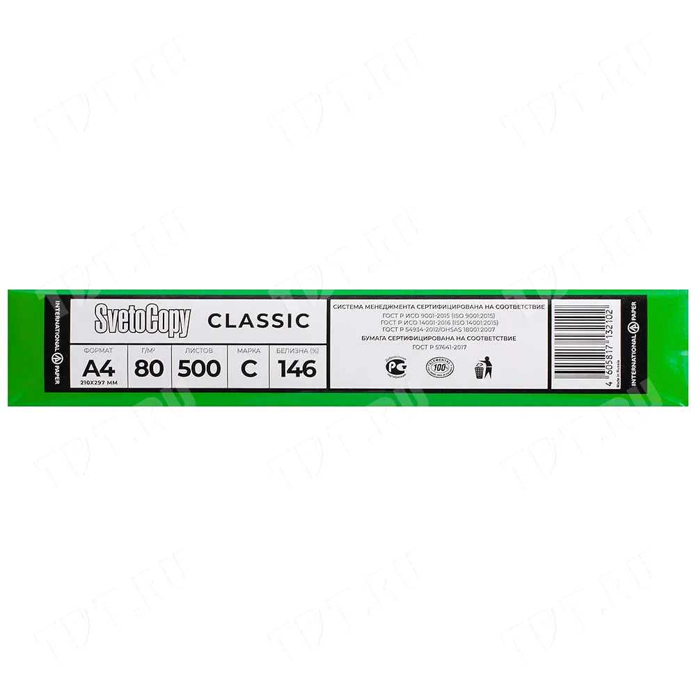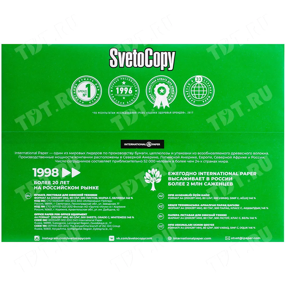 Универсальная офисная бумага SvetoCopy Classic (белого цвета), формата А4, диной 297 мм, шириной 210 мм, классом бумаги C, плотностью бумаги 80 г/м², толщиной 104 мкм, белизной 146%, непрозрачностью 91%, в упаковке по 500 штук, весом 2.456 кг. Производится в России.
