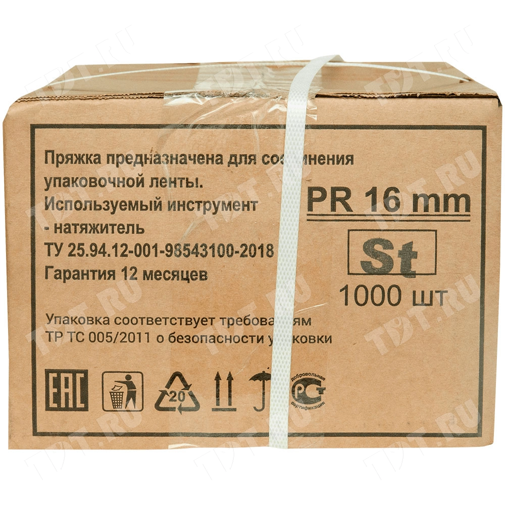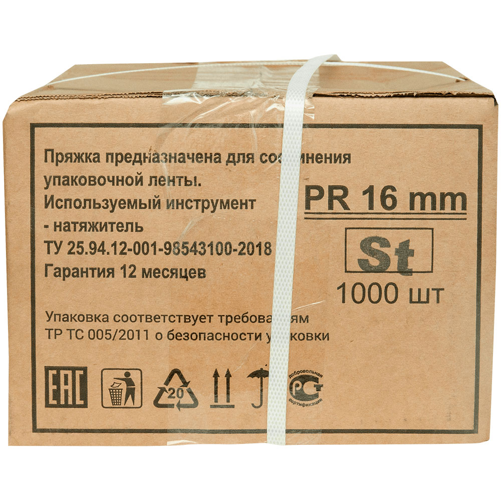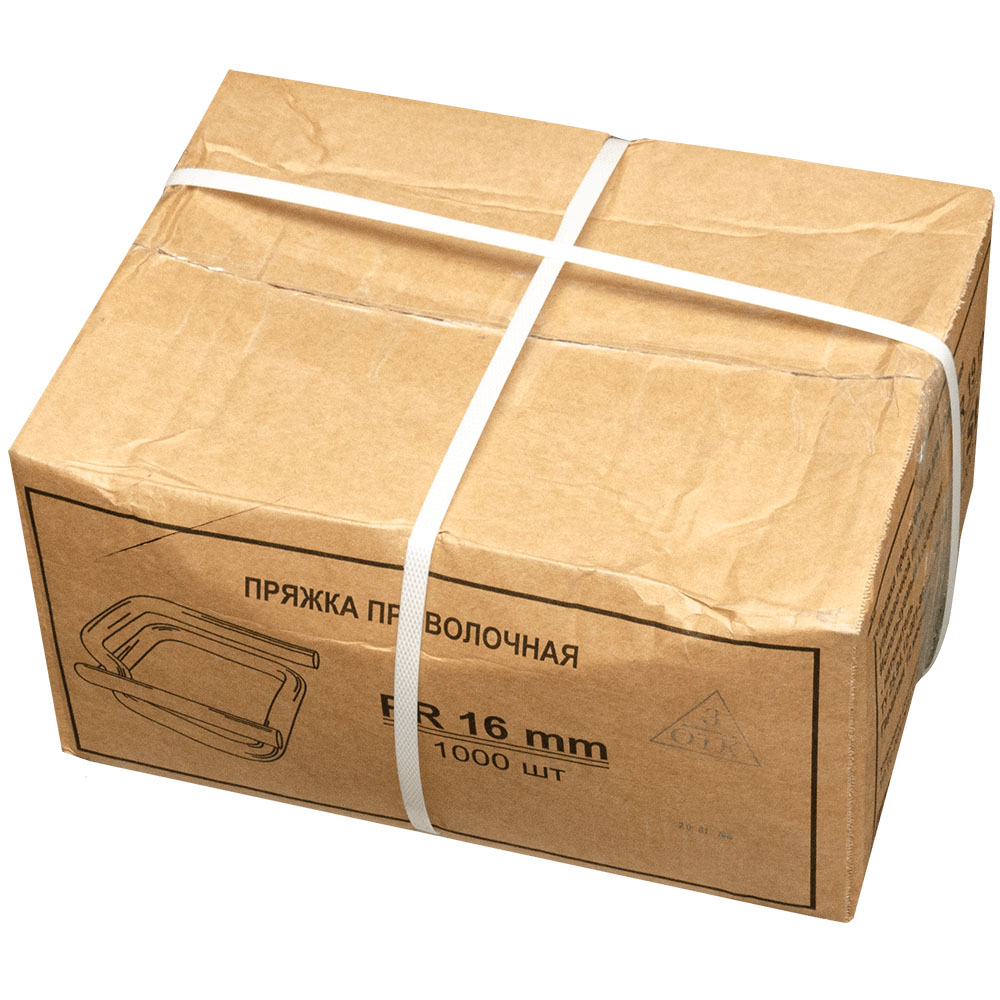 Проволочные пряжки шириной 16 мм для полипропиленовых и полипропиленовых лент, в упаковке по 1000 шт, весом 10 кг, транспортировочным объемом 0.011 м³. Пряжки подходят для лент шириной 15 и 15.5 мм. Производятся в России.