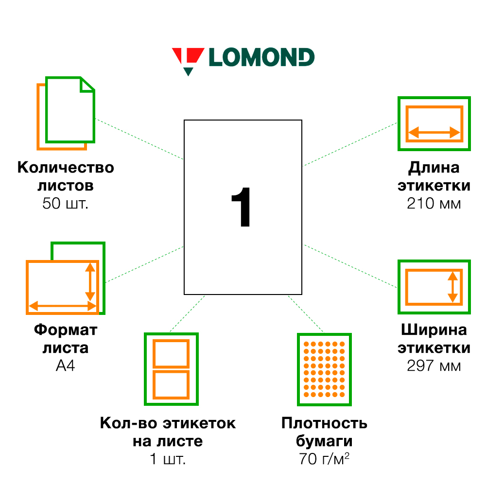 Самоклеящаяся бумага Lomond неделённая (белого цвета), формата А4, длиной 297 мм, шириной 210 мм, в упаковке по 50 штук, весом 496 г. Производится в России.