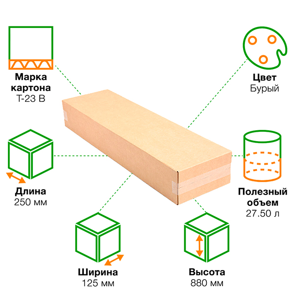 Короб №56 бурый, длиной 250 мм, шириной 125 мм и высотой 880 мм. Изготовлен из трёхслойного картона Т-23 В. Полезный объём — 27.50 л.