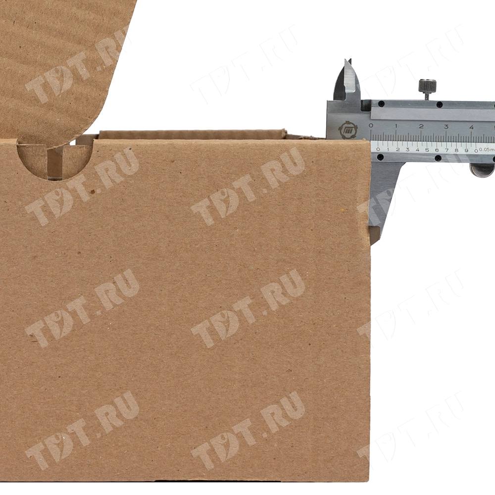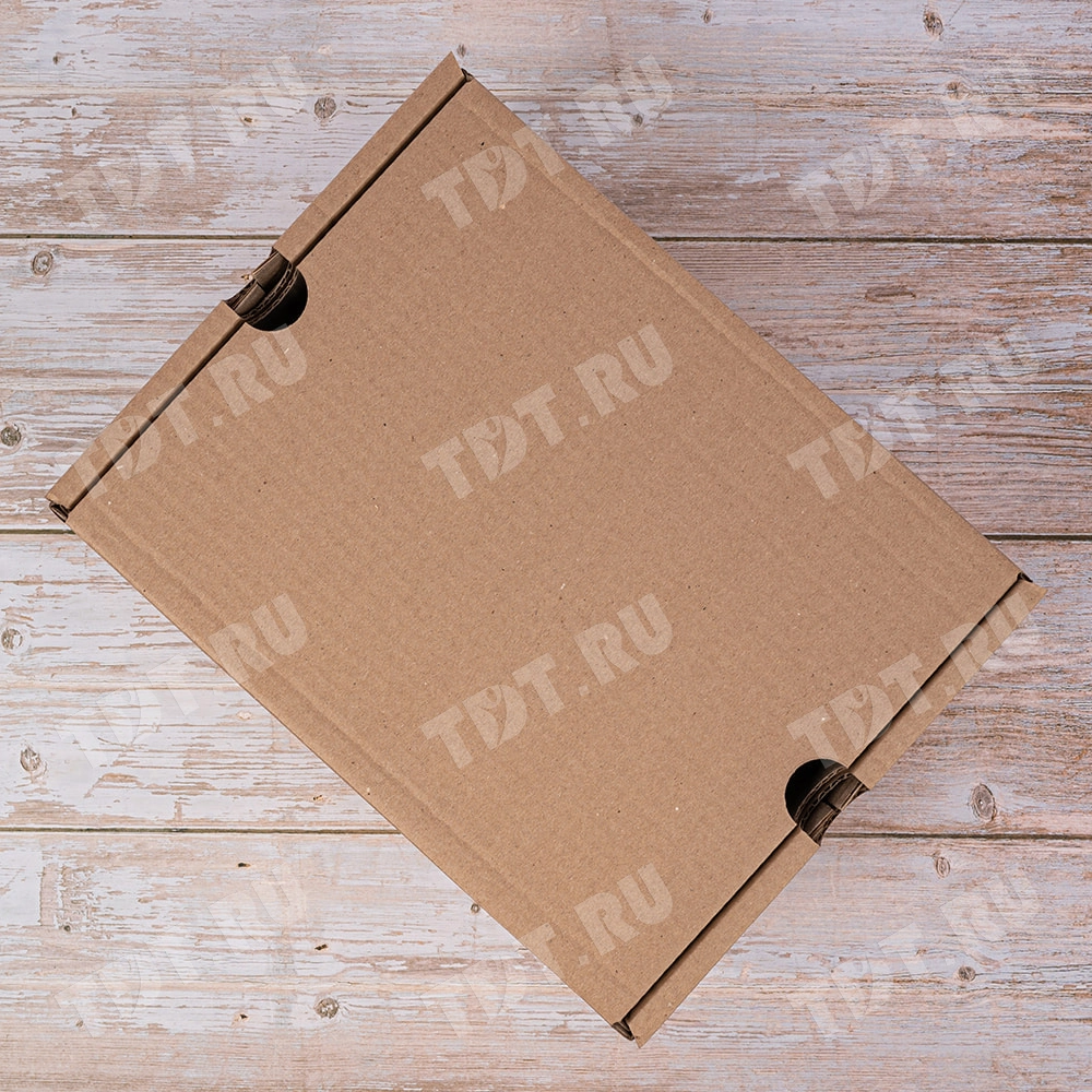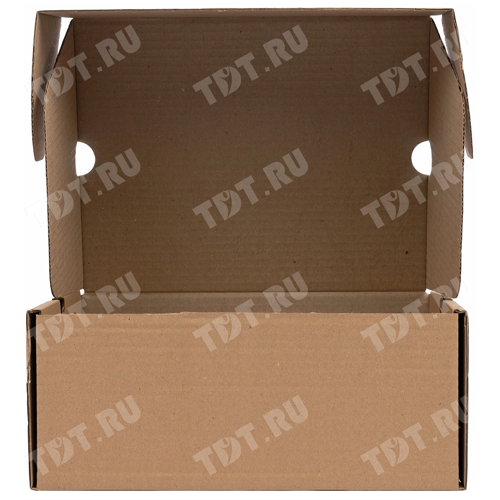 Коробка для обуви №75 бурого цвета, длиной 300 мм, шириной 240 мм и высотой 130 мм. Изготовлена из трёхслойного гофрокартона Т-23 В. Полезный объём — 9.4 л.