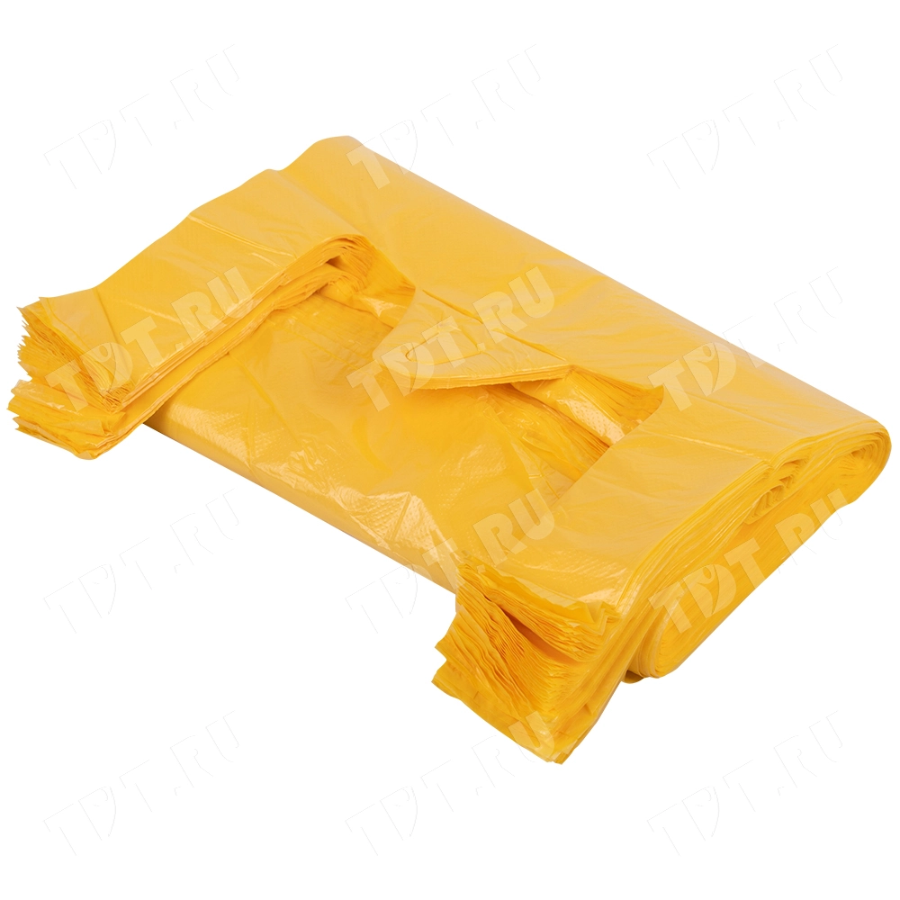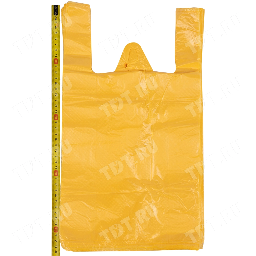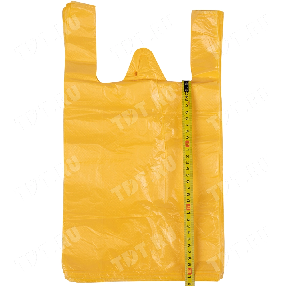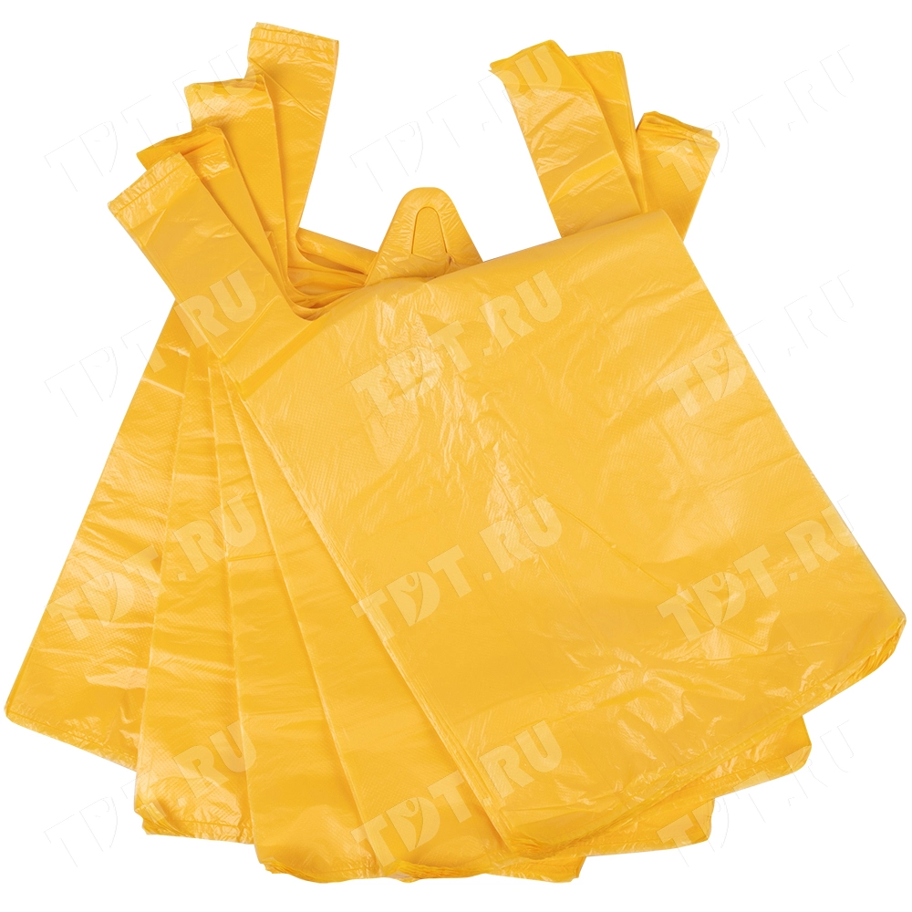 Полиэтиленовые пакеты майка ПНД, желтого цвета, длиной 45 см, шириной 25+12 см, толщиной 11 мкм, в упаковке 100 штук. Материал – полиэтилен низкого давления. Производятся в России.