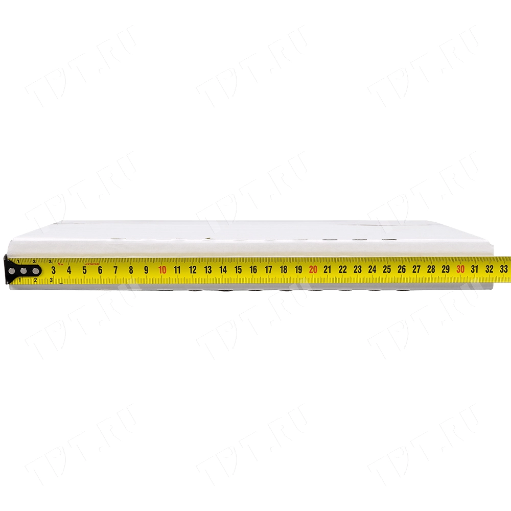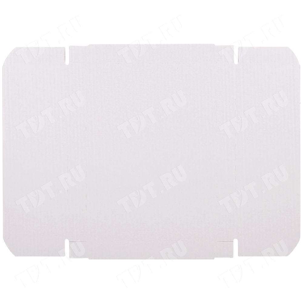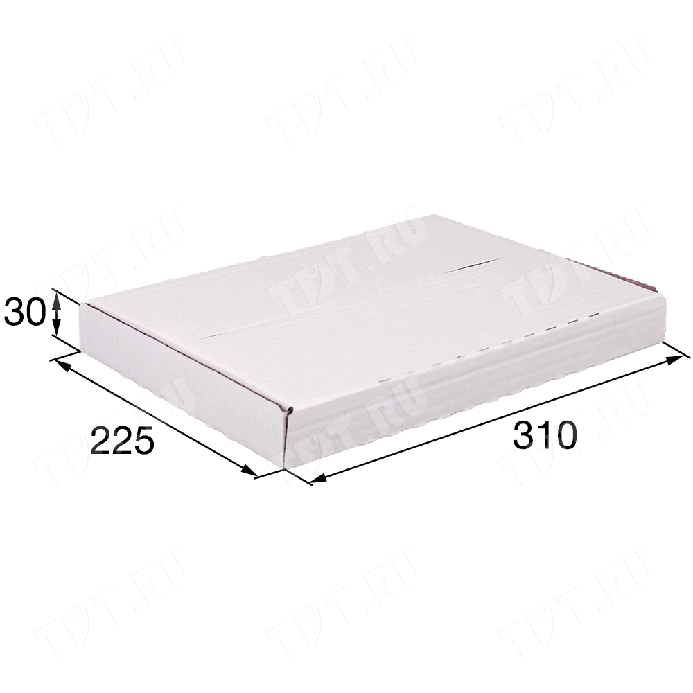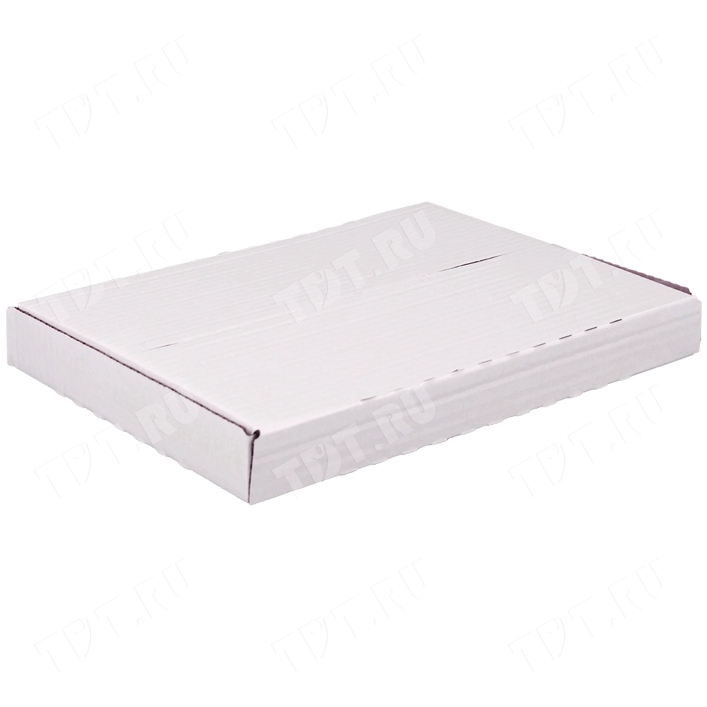 Книжный лоток №4, белый, длиной 310 мм, шириной 225 мм и высотой 30 мм. Изготовлен из трёхслойного картона Т-23 В. Полезный объём — 2.2 л.
