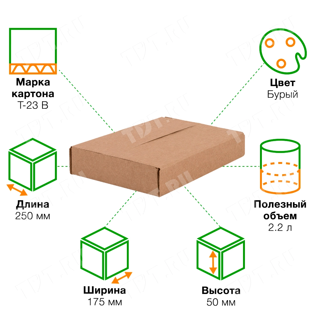 Книжный лоток №6, бурый, длиной 250 мм, шириной 175 мм и высотой 50 мм. Изготовлен из трёхслойного картона Т-23 В. Полезный объём — 2.2 л.