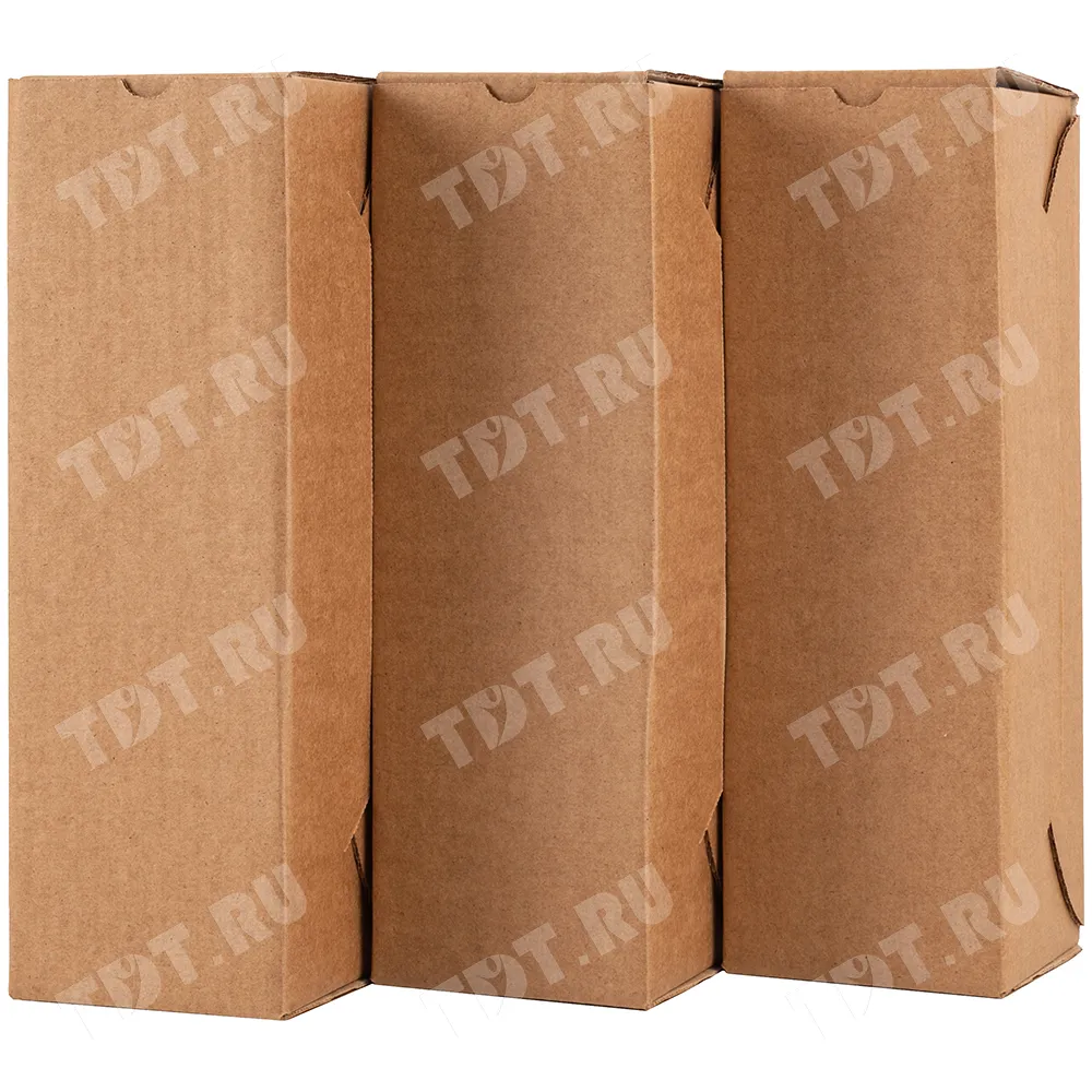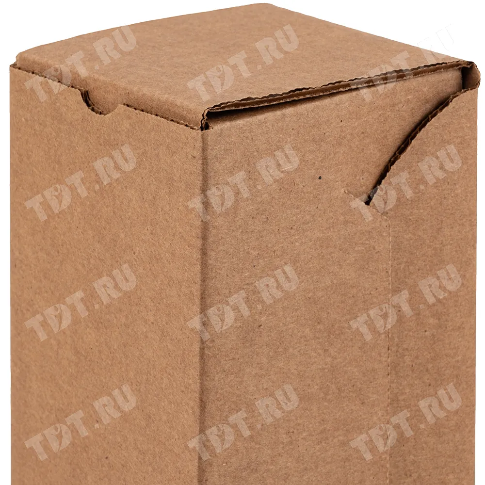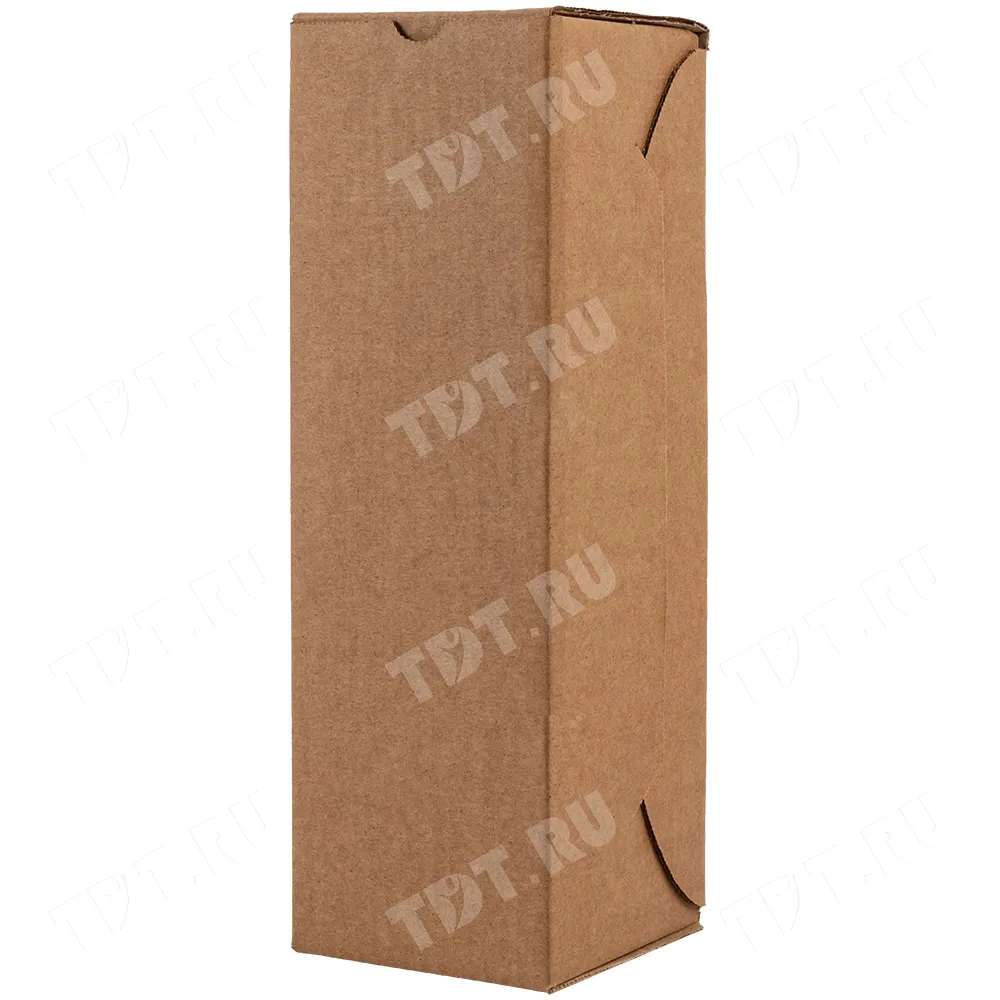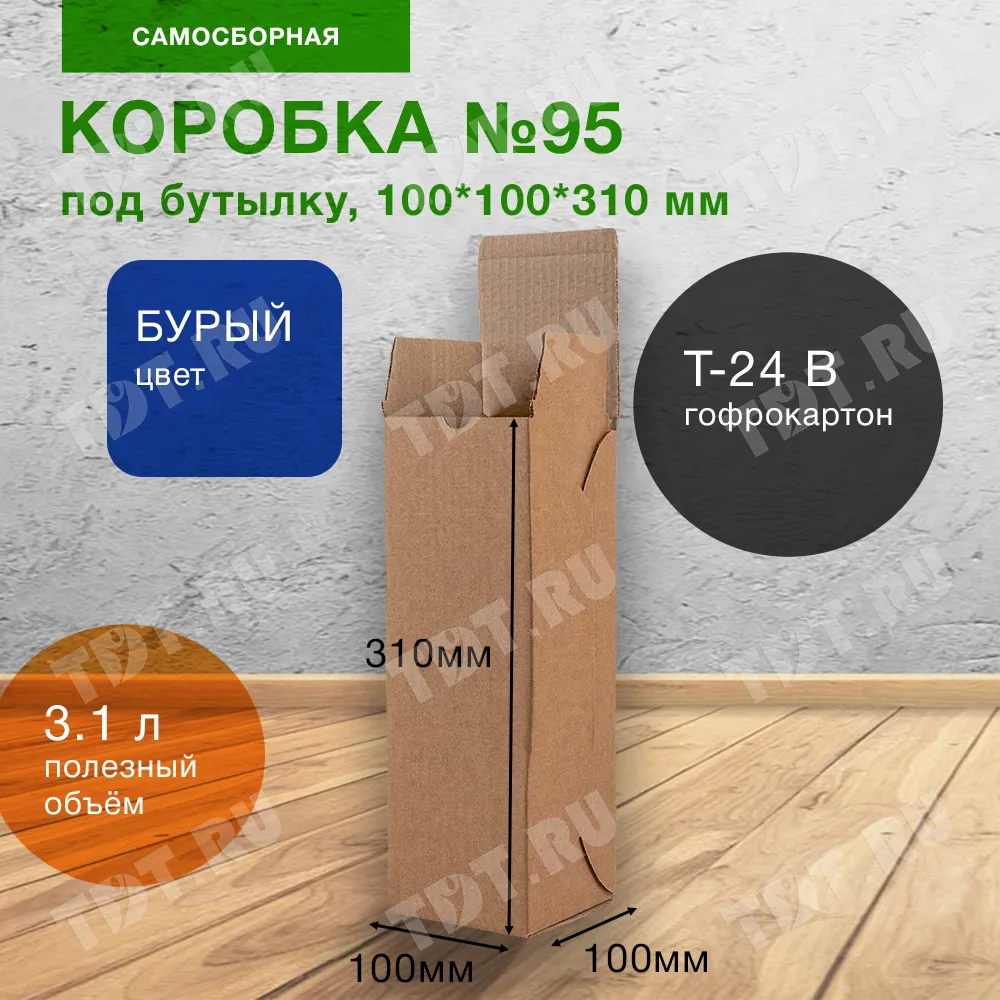 Коробка для бутылки №95, бурая, длиной 100 мм, шириной 100 мм и высотой 310 мм. Изготовлена из трёхслойного картона Т-24 В. Полезный объём — 3.1 л.