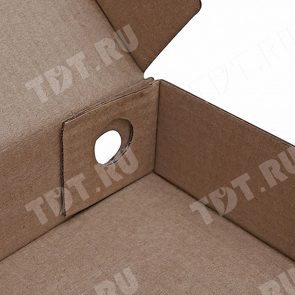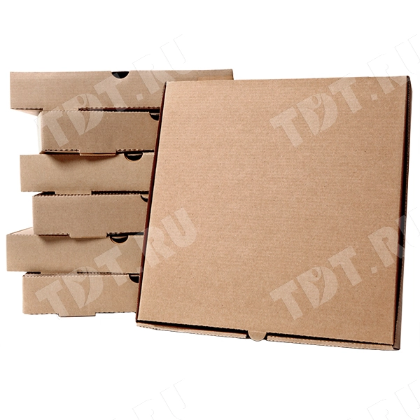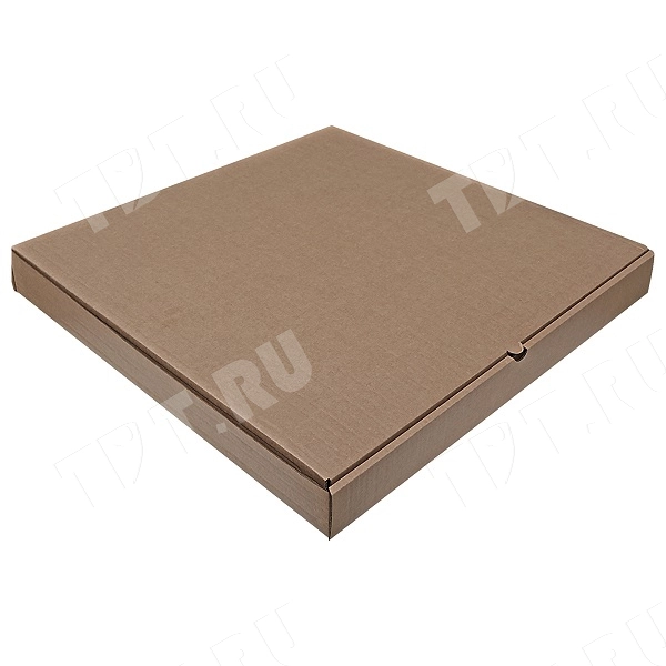 Бурая коробка для пиццы (большая), длиной 460 мм, шириной 460 мм и высотой 50 мм. Изготовлена из трехслойного картона марки Т-23. Полезный объём — 10.58 л. Производится в России.