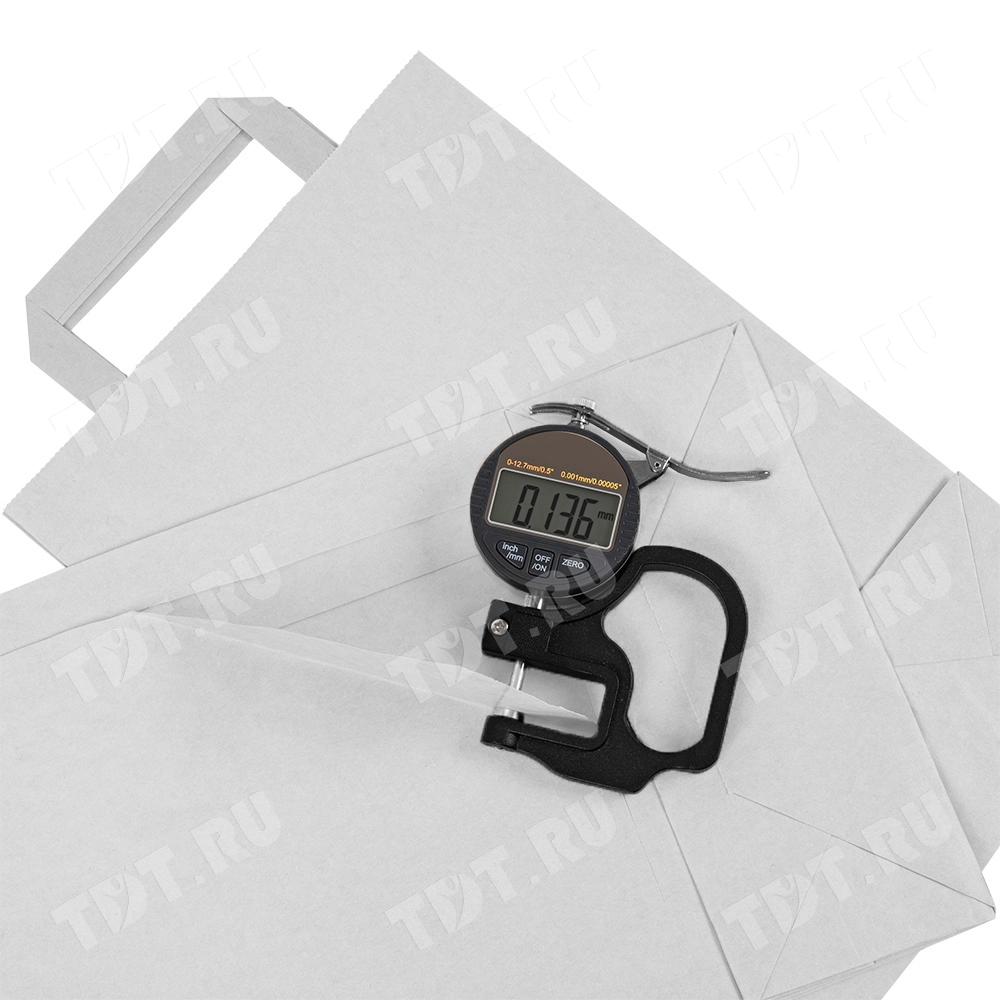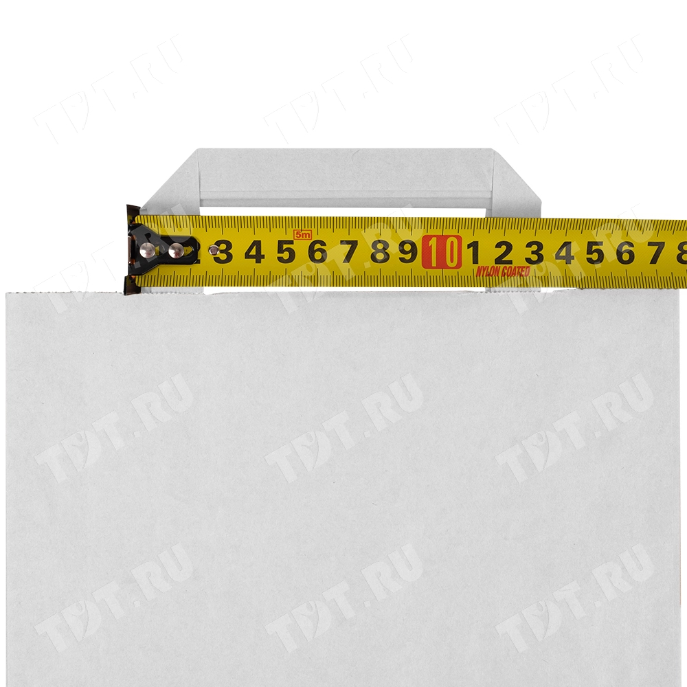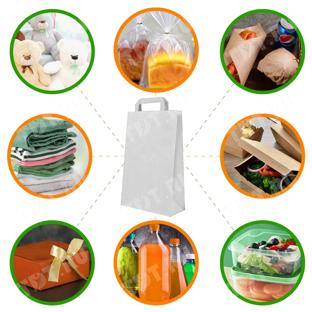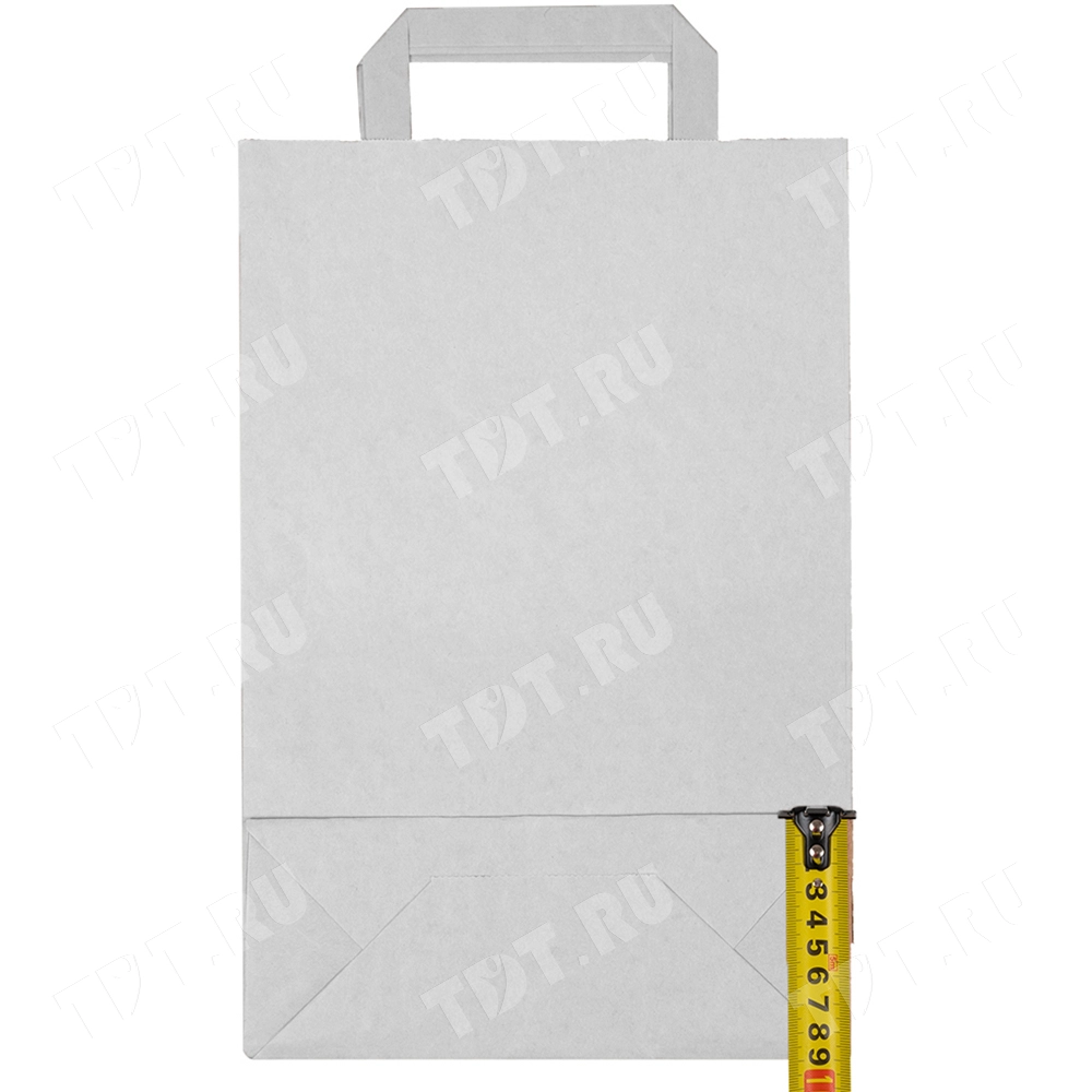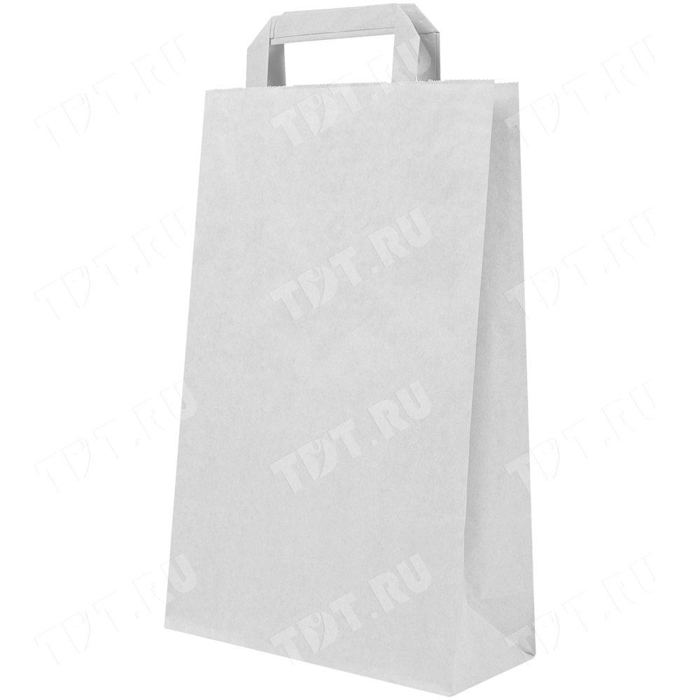 Бумажный белый крафт пакет с плоской ручкой шириной 90 мм, длиной 220 мм, высотой 330 мм изготовлен из экологичного материала. Пакеты производятся в России.
