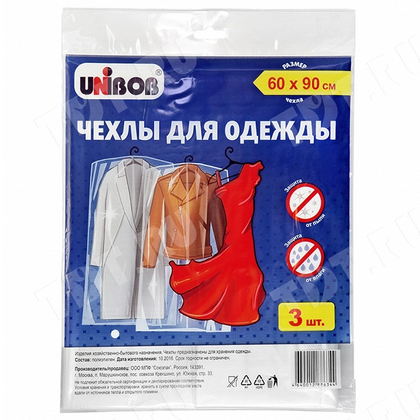 Чехлы для хранения одежды «UNIBOB®», прозрачного цвета, длиной 60 см, высотой 90 см, толщиной 11 мкм, весом 37 г, в упаковке по 3 штуки. Материал – полиэтилен. Производятся в России.