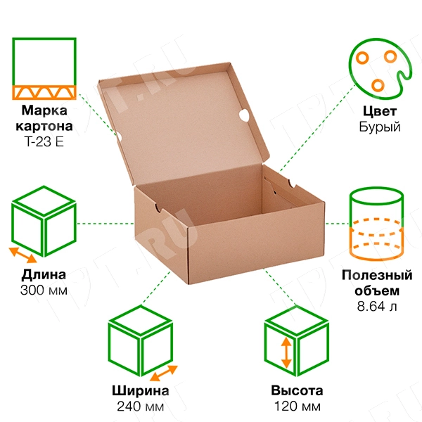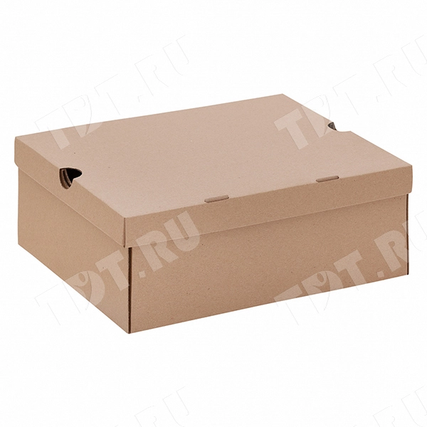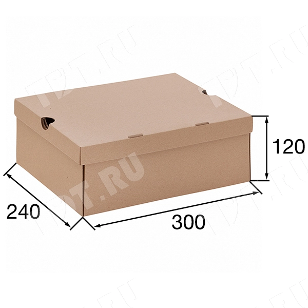 Коробка для обуви №75/1 бурого цвета, длиной 300 мм, шириной 240 мм и высотой 120 мм. Изготовлена из микрогофрокартона Т-23 Е. Полезный объём — 8.64 л.