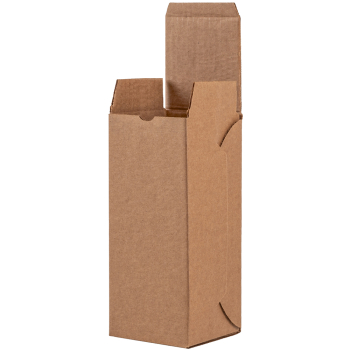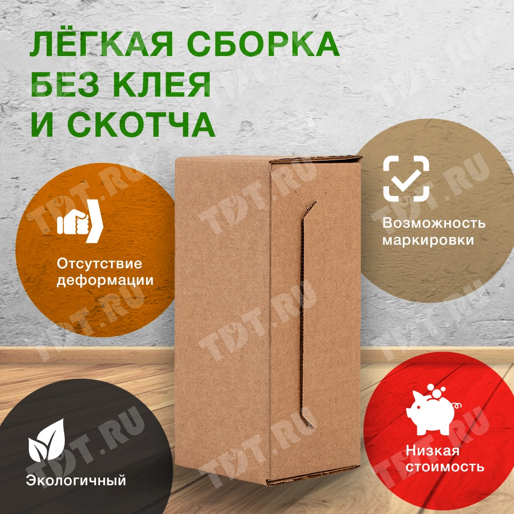 Коробка для бутылки №97, бурая, длиной 90 мм, шириной 90 мм и высотой 200 мм. Изготовлена из трёхслойного картона Т-23. Полезный объём — 1.62 л.