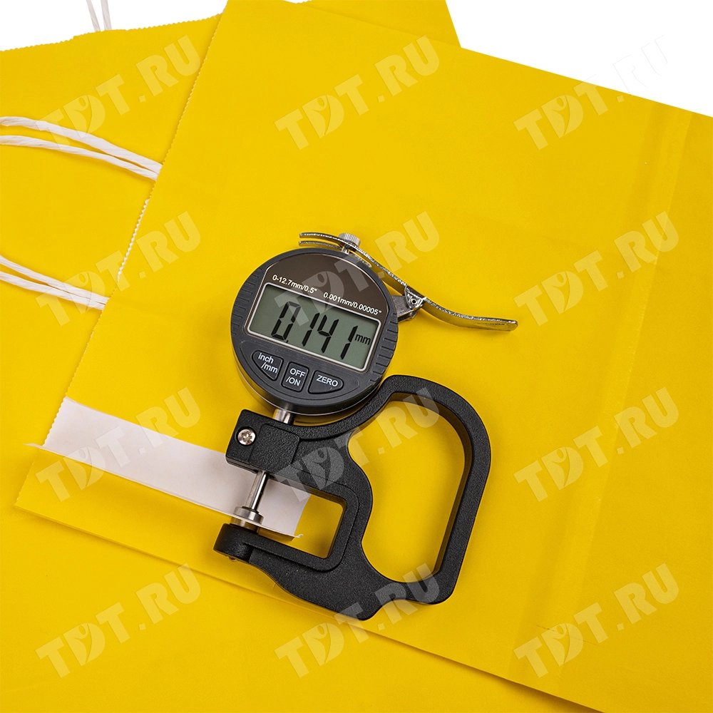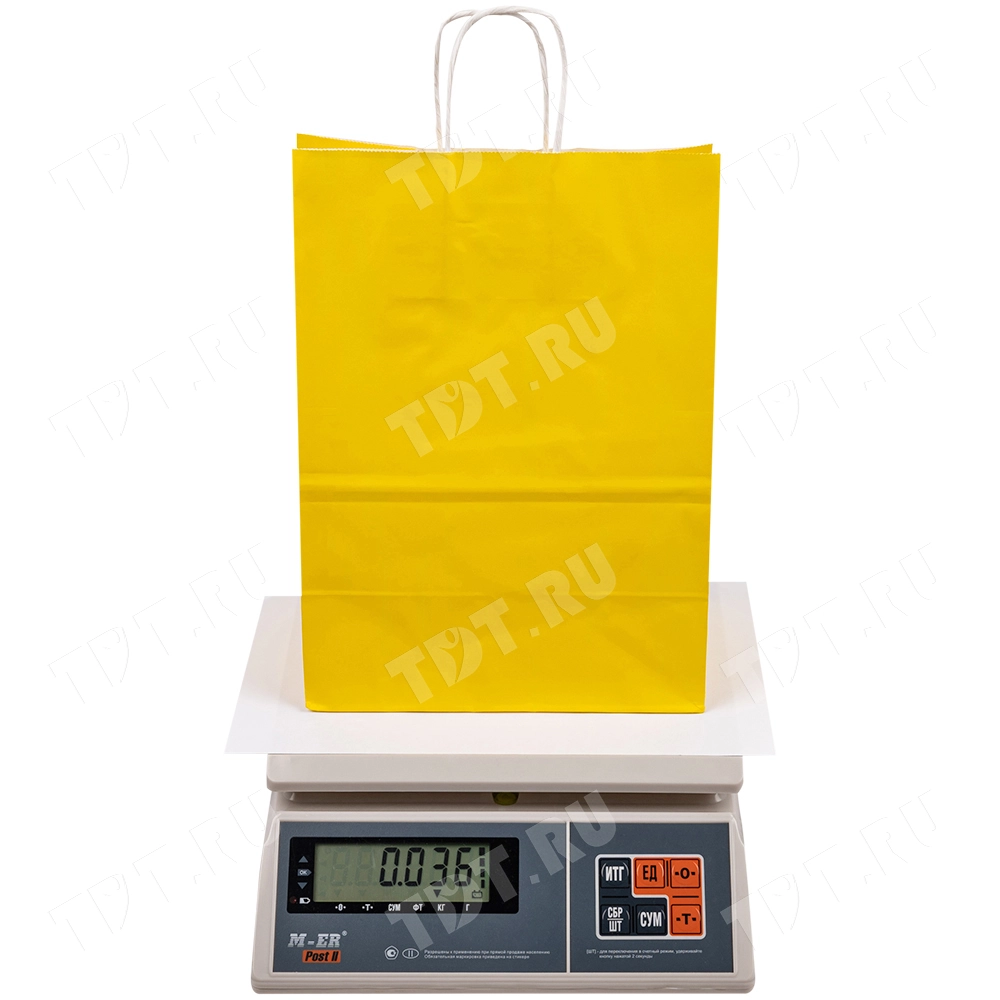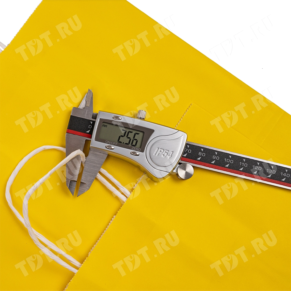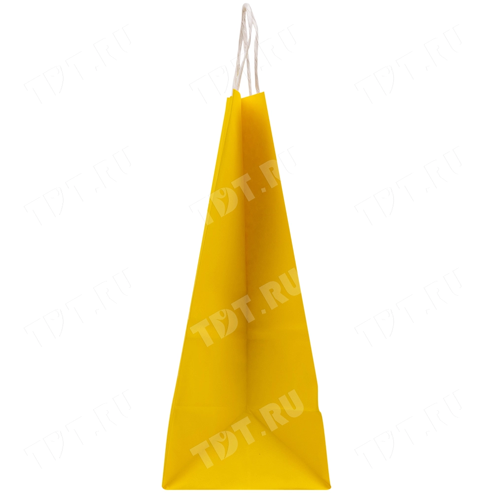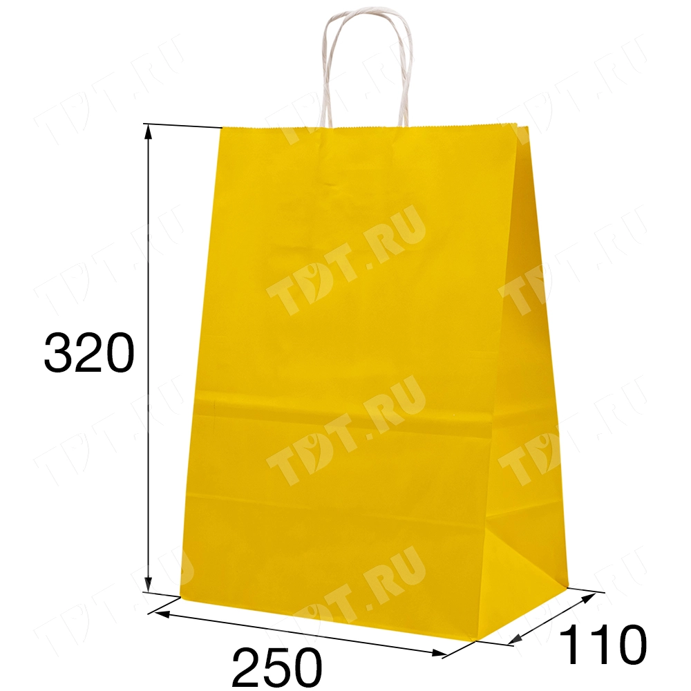 Жёлтый бумажный крафт пакет с крученой ручкой шириной 110 мм, длиной 250 мм, высотой 320 мм изготовлен из экологичного материала. Пакеты производятся в России.