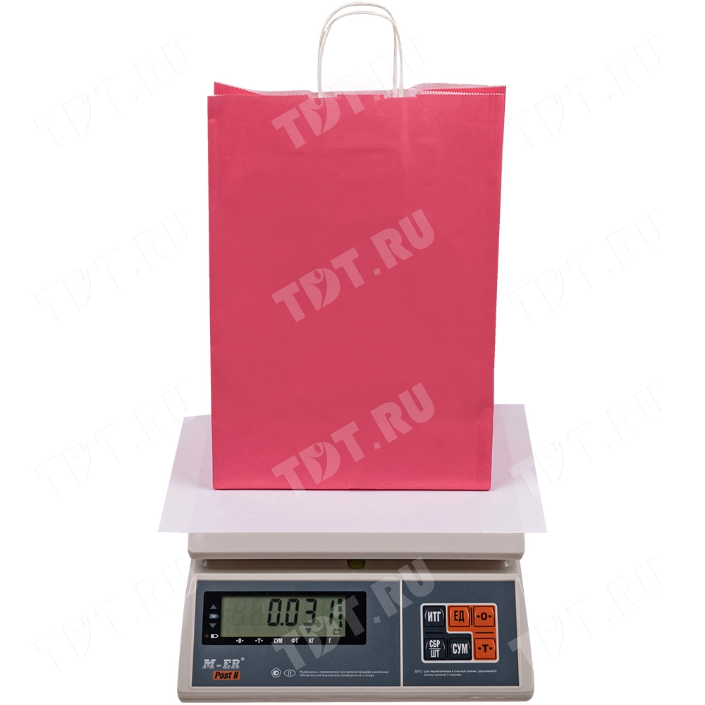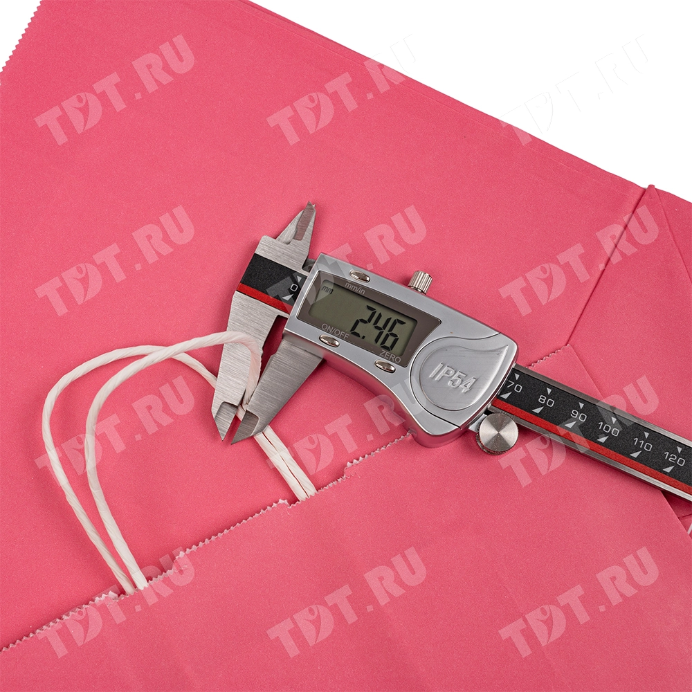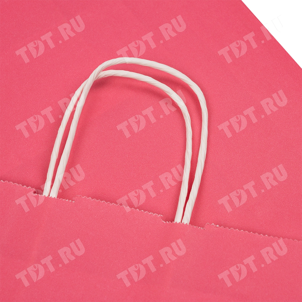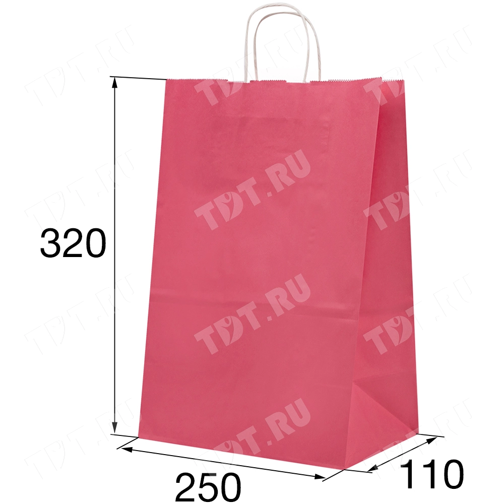 Розовый бумажный крафт пакет с крученой ручкой шириной 110 мм, длиной 250 мм, высотой 320 мм изготовлен из экологичного материала. Пакеты производятся в России.