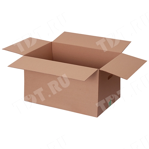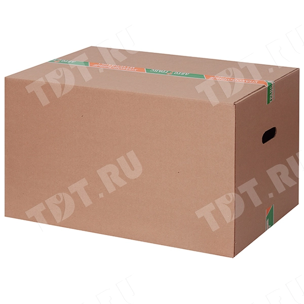 Картонный короб №19/1 (пятислойный), с ручками, длиной 600 мм, шириной 400 мм и высотой 400 мм. Изготовлен из пятислойного гофрокартона марки П-32 ВС. Полезный объём — 96 л.
