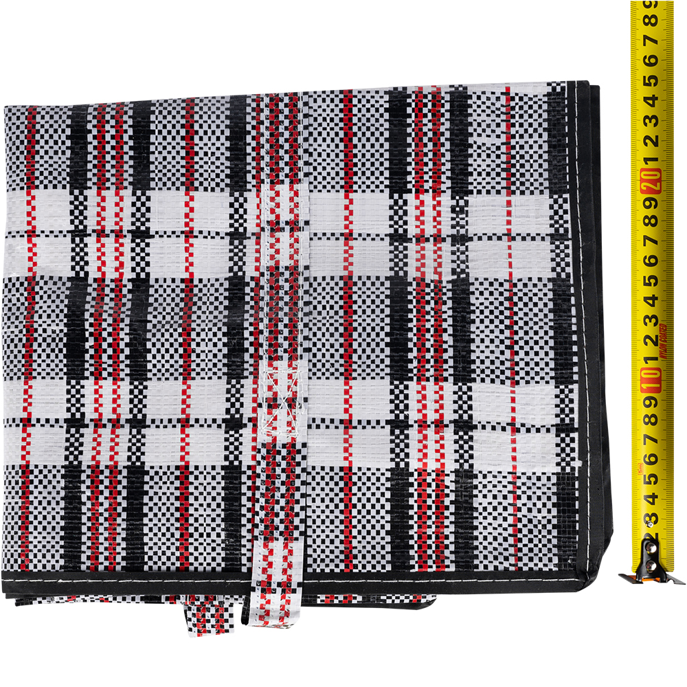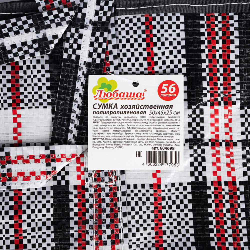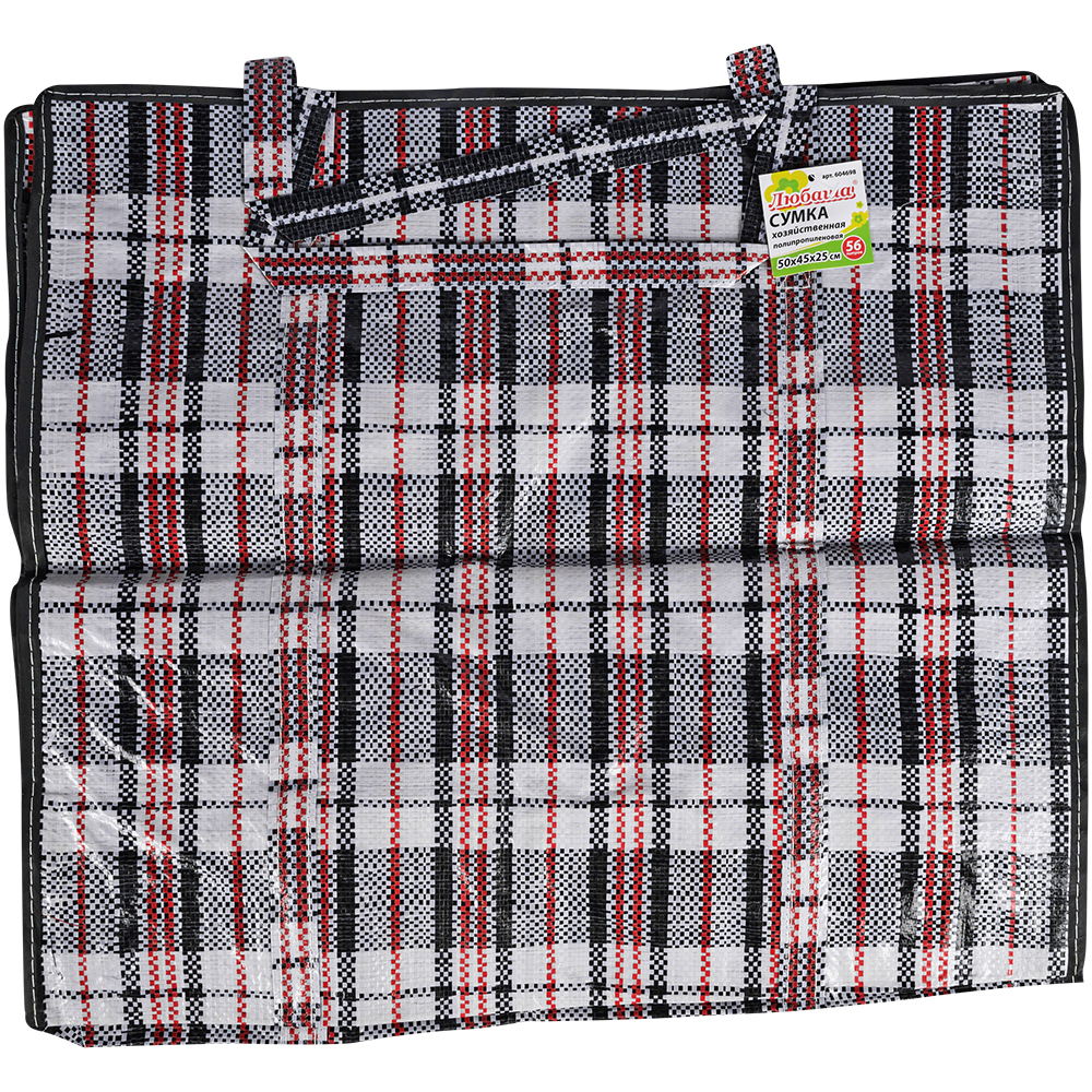 Сумка-баул однослойная хозяйственная длиной 50 см, шириной 25 см, высотой 45 см, объемом 56 л, чёрно-красная. Материал полипропилен. Имеет прострочку по периметру. Занимает мало места в сложенном виде. Производится в Китае.