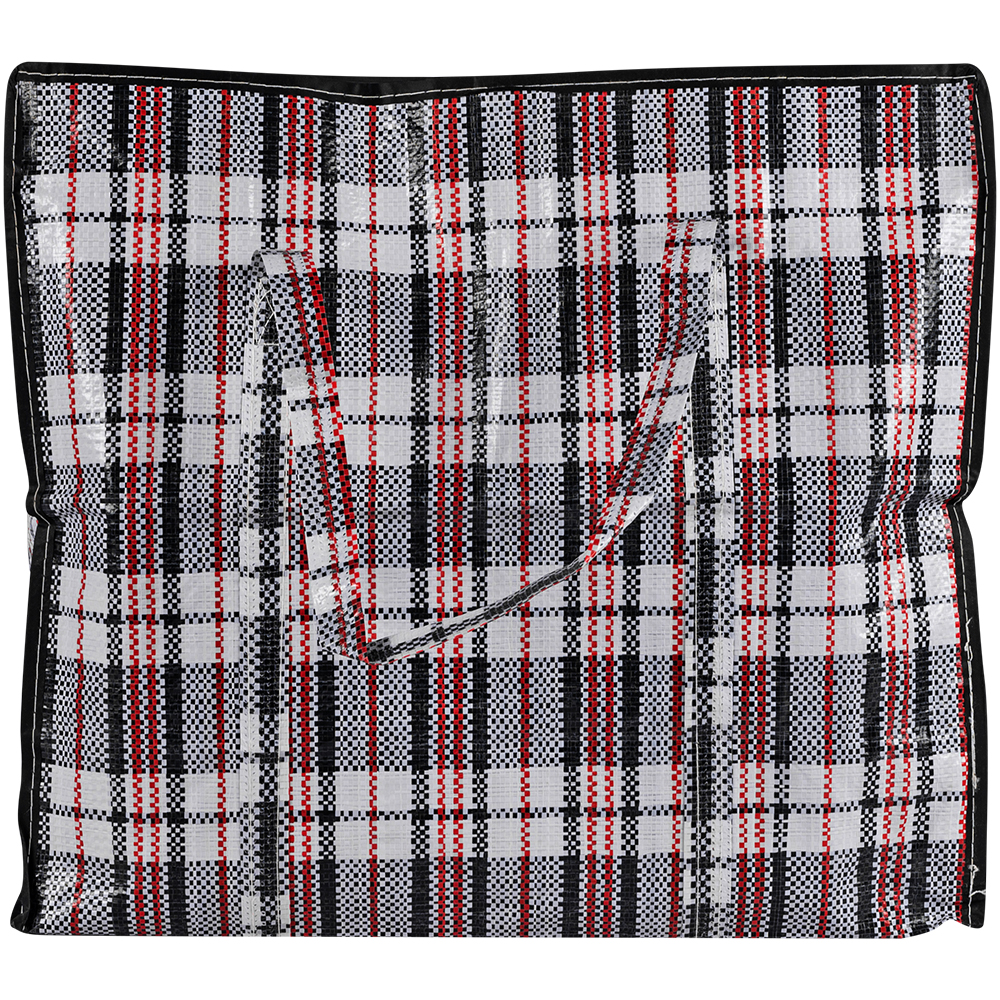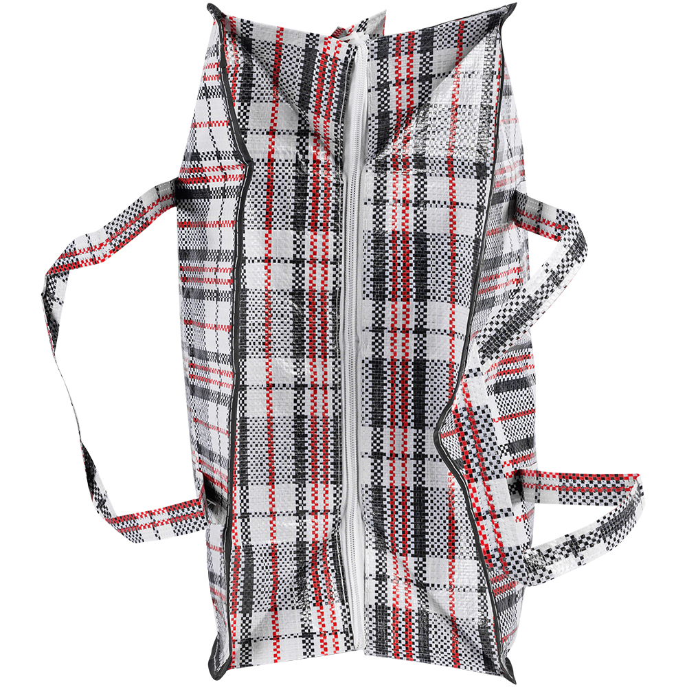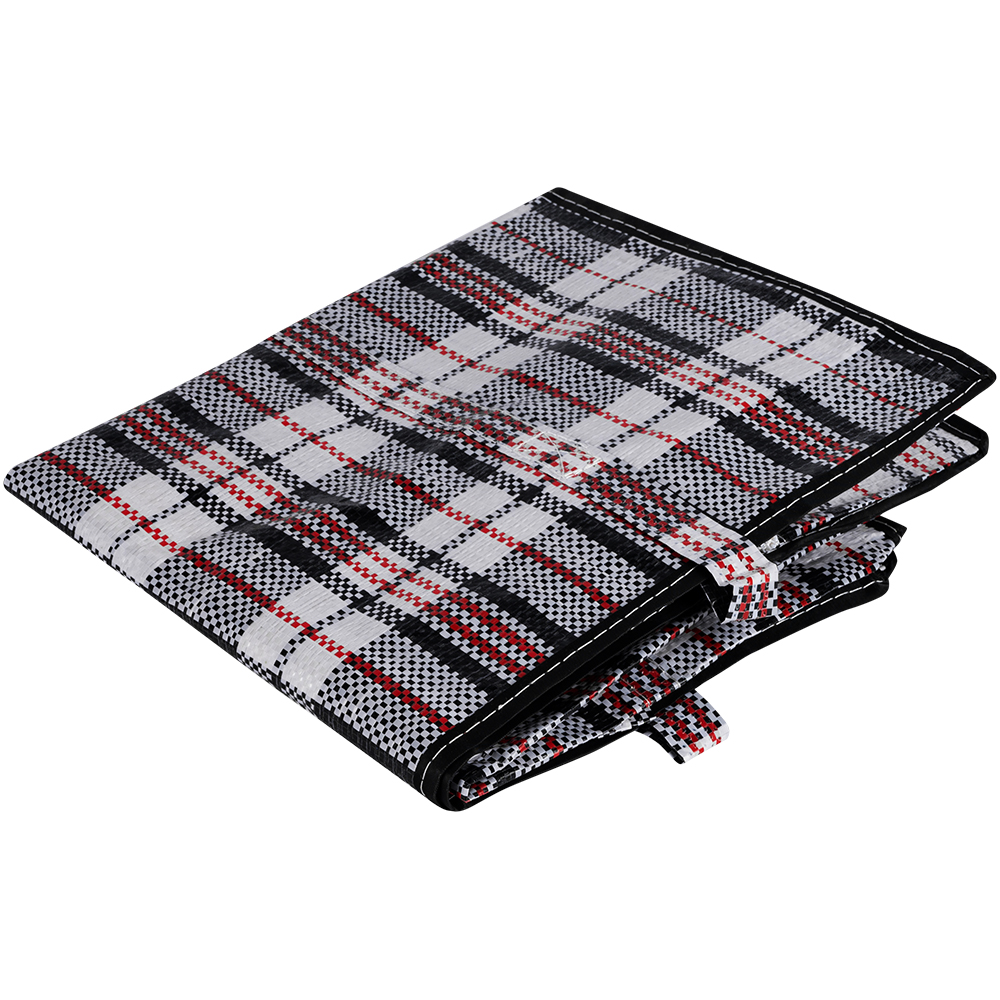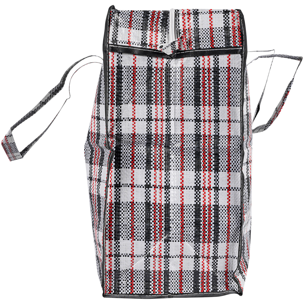 Сумка-баул однослойная хозяйственная длиной 60 см, шириной 25 см, высотой 45 см, объемом 68 л, чёрно-красная. Материал полипропилен. Имеет прострочку по периметру. Занимает мало места в сложенном виде. Производится в Китае.