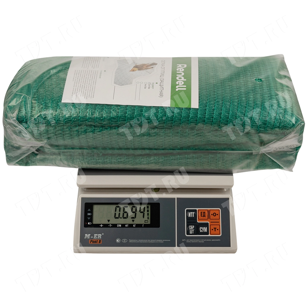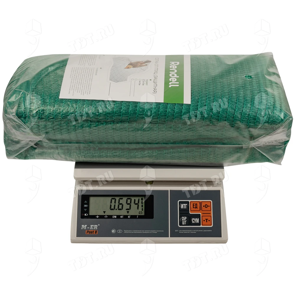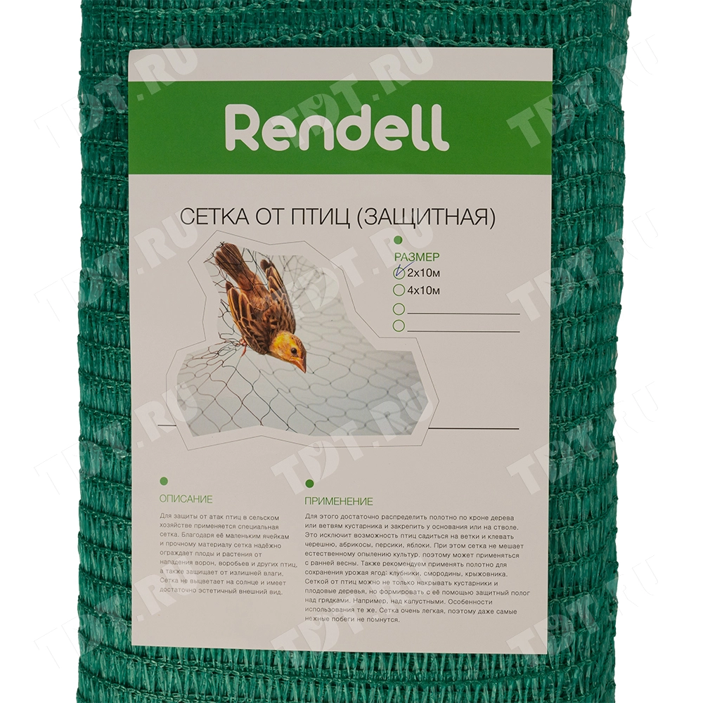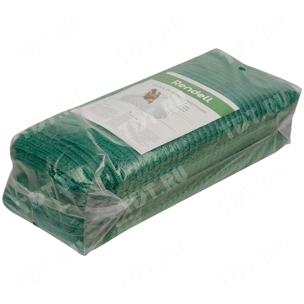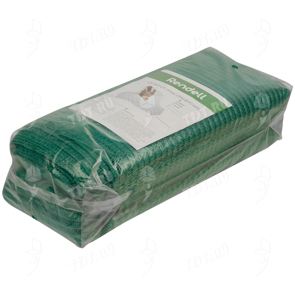 Зеленая фасадная сетка Rendell для защиты от птиц, длиной 10 м, шириной 2 м, площадью рулона 20 м², плотностью 35 г/м², размером ячейки 1.5*10 мм, затенением 35-40%, весом 694 г. Материал – HDPE. Производится в России.