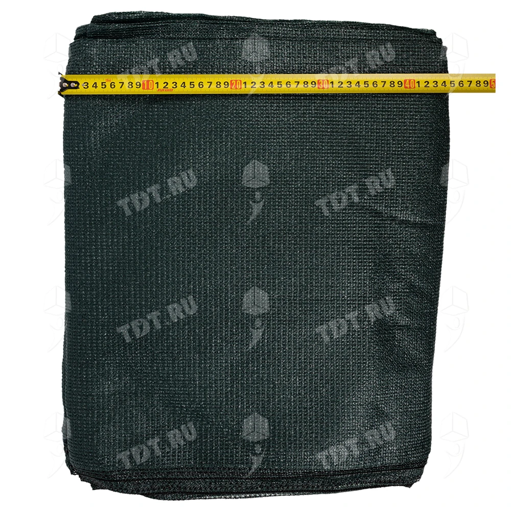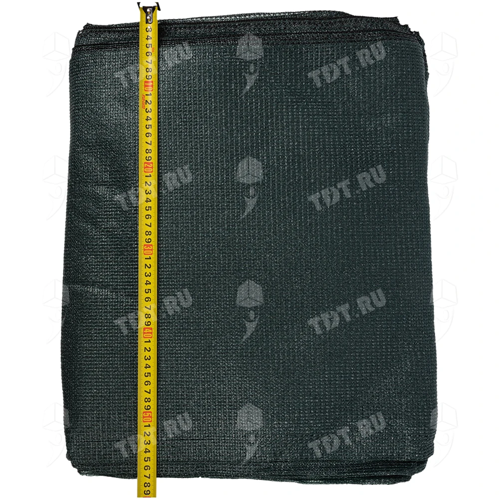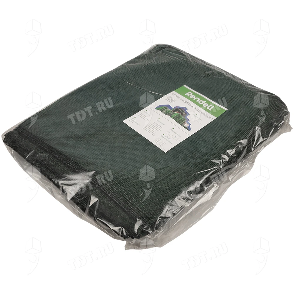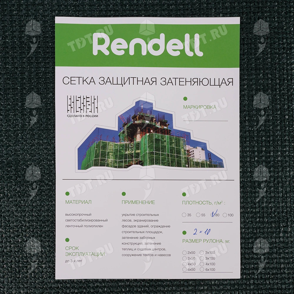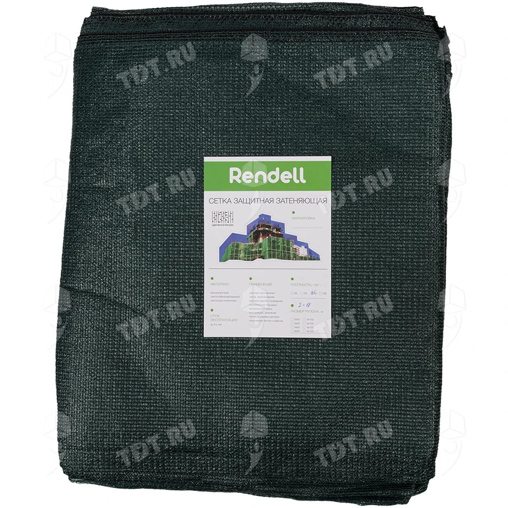 Темно-зеленая фасадная сетка Rendell PRO для строительных лесов, заборов, длиной 10 м, шириной 2 м, площадью рулона 20 м², плотностью 80 г/м², размером ячейки 1*7 мм, затенением 80-85%, весом 1.65 кг. Материал – HDPE. Производится в России.