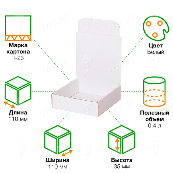 Короб КС-403 МГФ, серии КС-400, белый, длиной 110 мм, шириной 110 мм и высотой 35 мм. Изготовлен из микрогофрокартона Т-23. Полезный объём — 0.4 л.