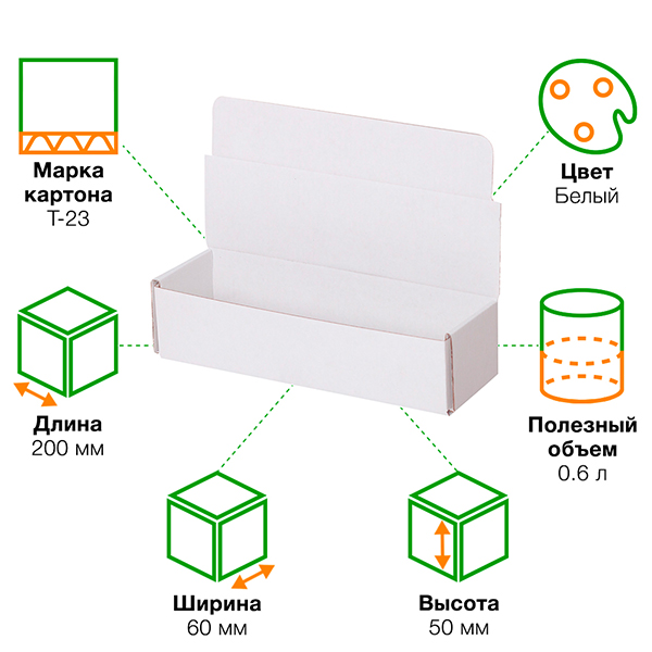 Короб КС-409 МГФ, серии КС-400, белый, длиной 200 мм, шириной 60 мм и высотой 50 мм. Изготовлен из микрогофрокартона Т-23. Полезный объём — 0.6 л.