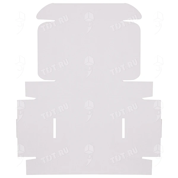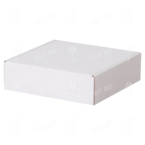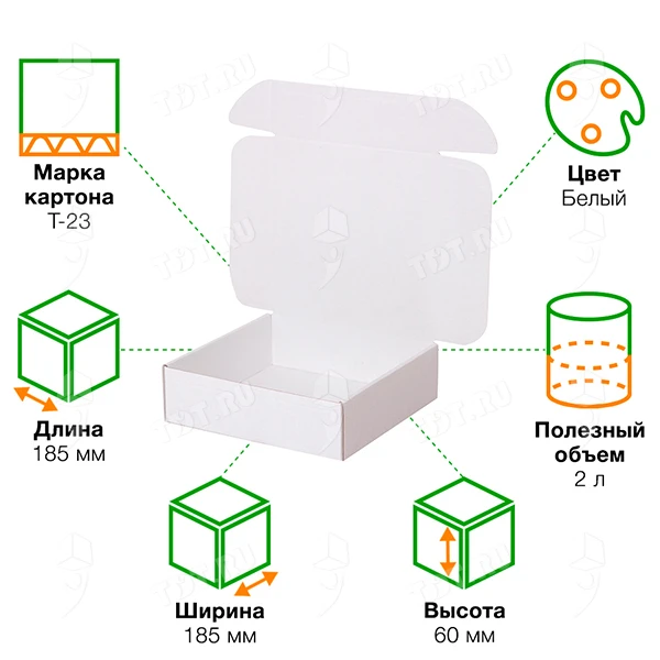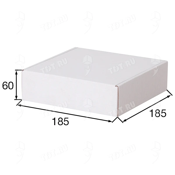 Короб КС-426 МГФ, серии КС-400, белый, длиной 185 мм, шириной 185 мм и высотой 60 мм. Изготовлен из микрогофрокартона Т-23. Полезный объём — 2 л.