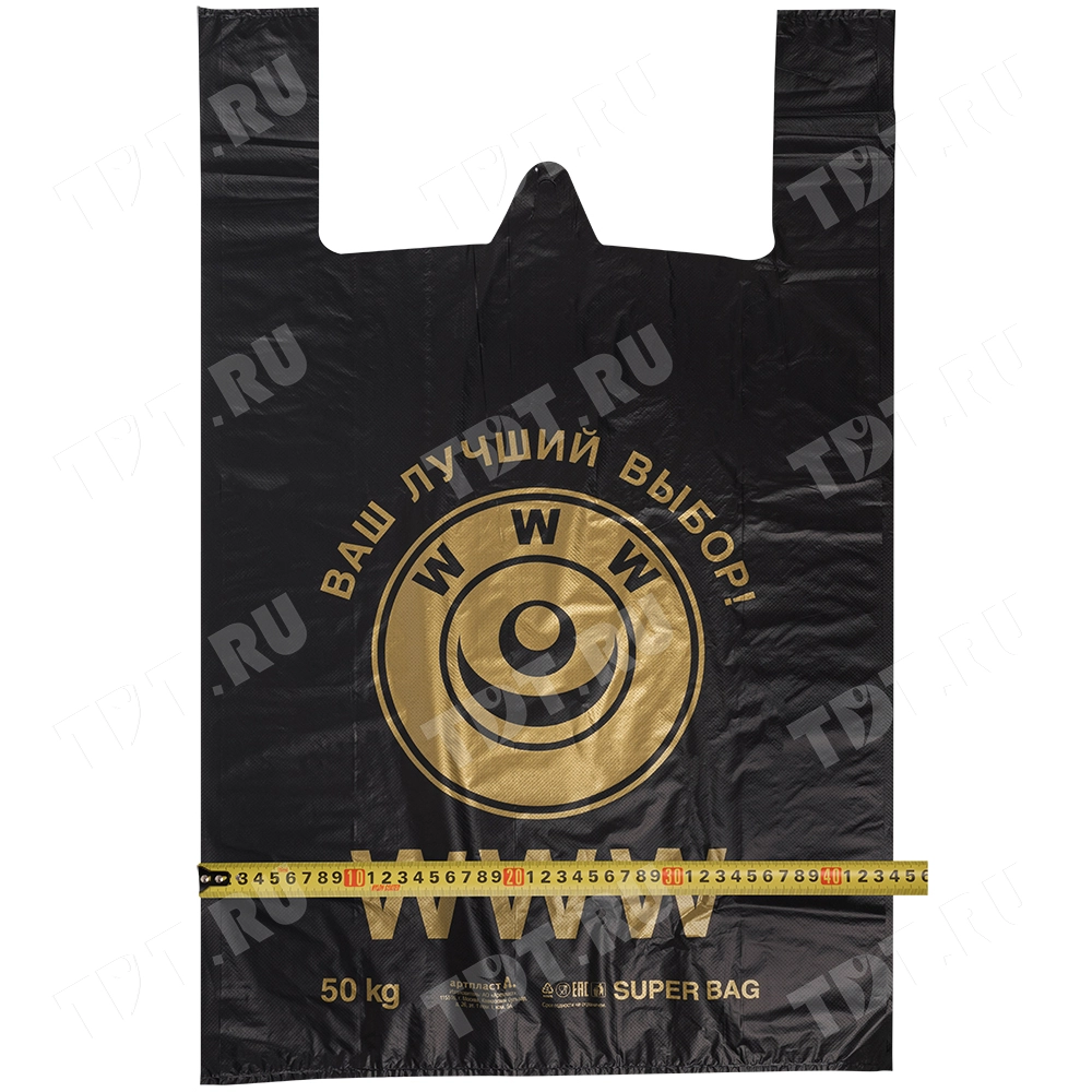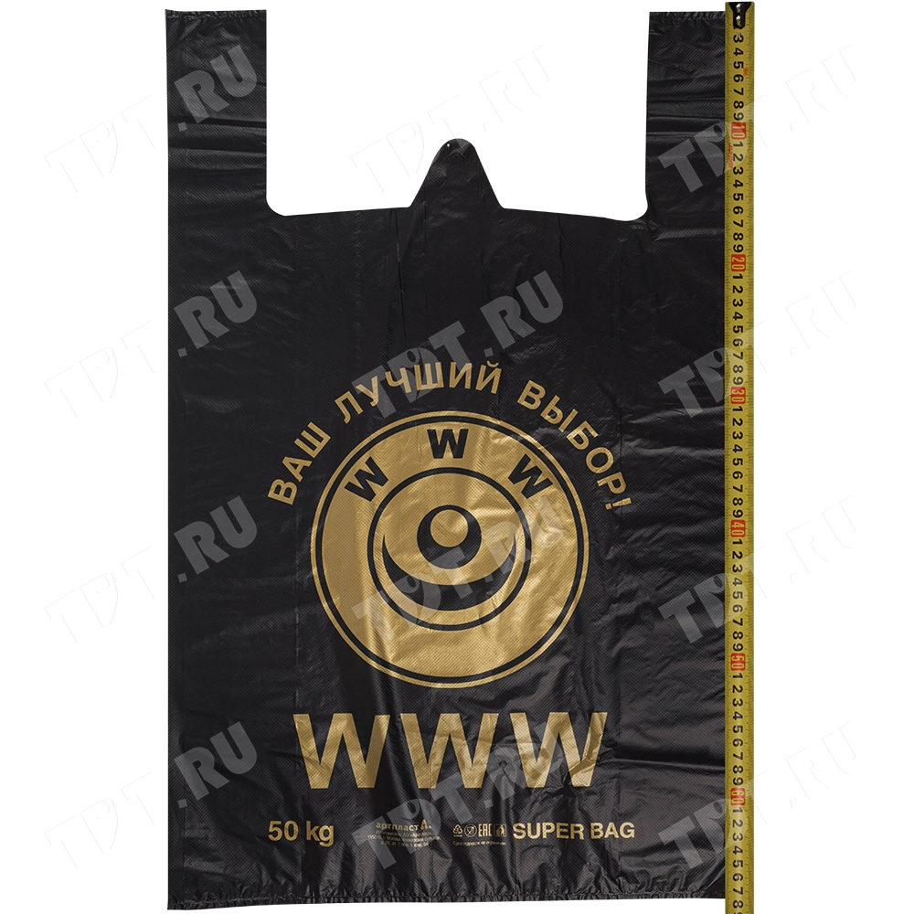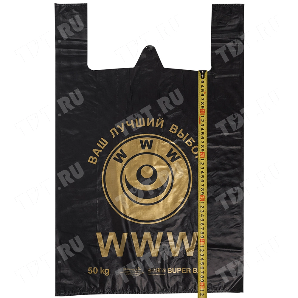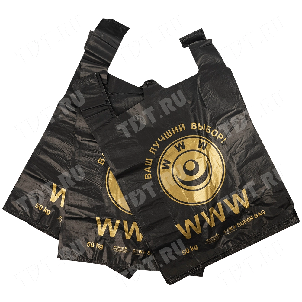 Полиэтиленовые пакеты майка ПНД «WWW» с надписями, черного цвета, длиной 69 см, шириной 43+20 см, толщиной 33 мкм, в упаковке 50 штук. Материал – полиэтилен низкого давления. Производятся в России.