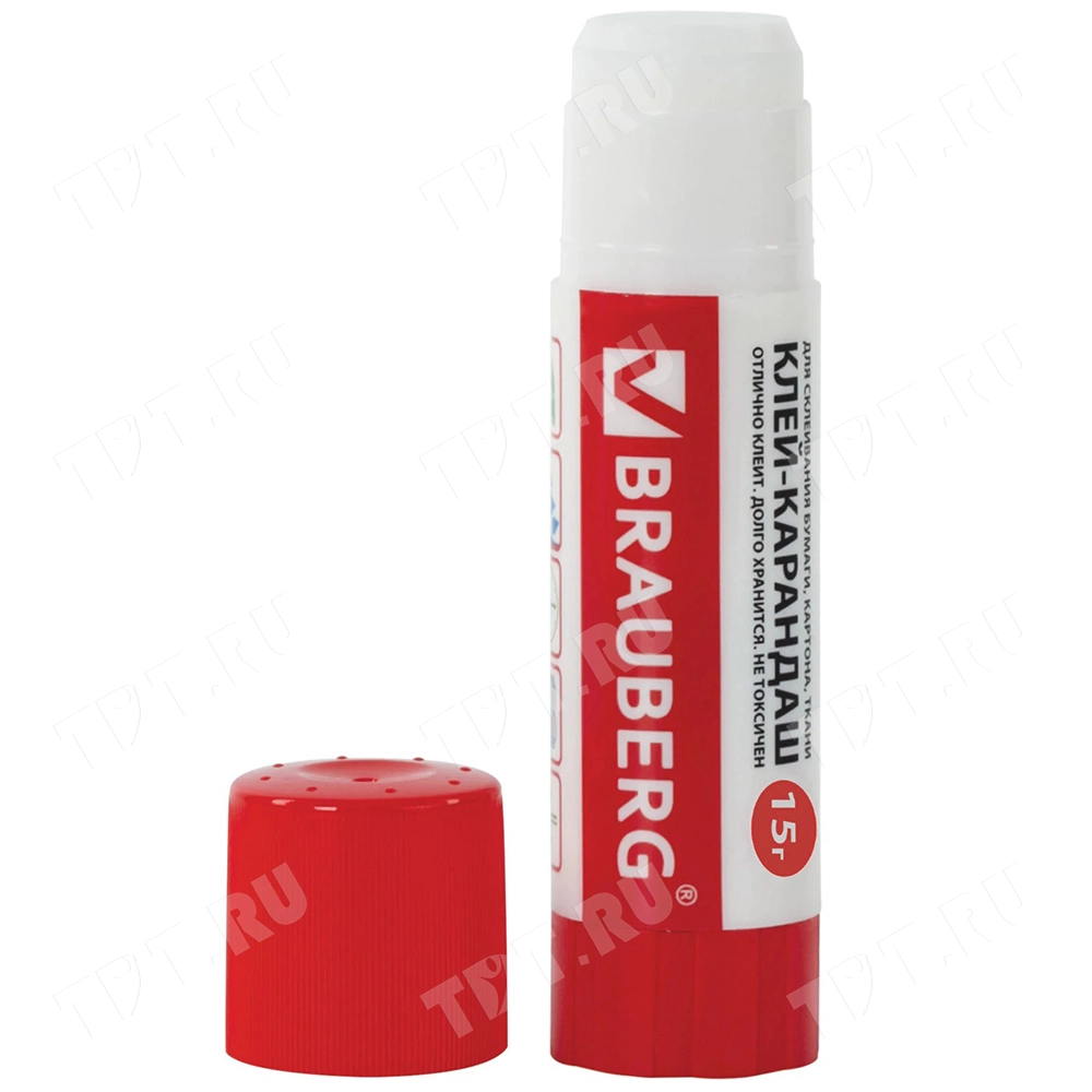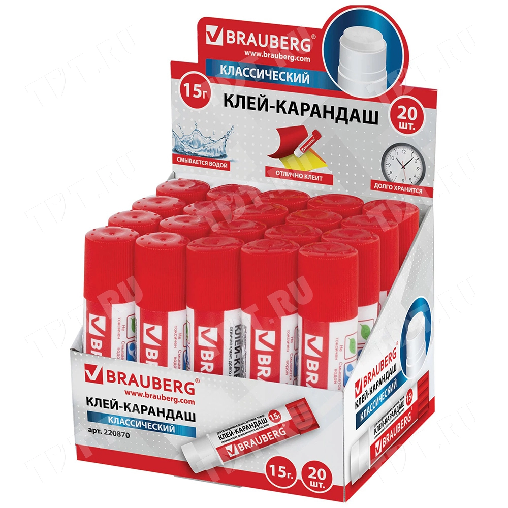 Клей-карандаш BRAUBERG, код производителя 220870, белого цвета, объемом 15 г. Производится в Китае.