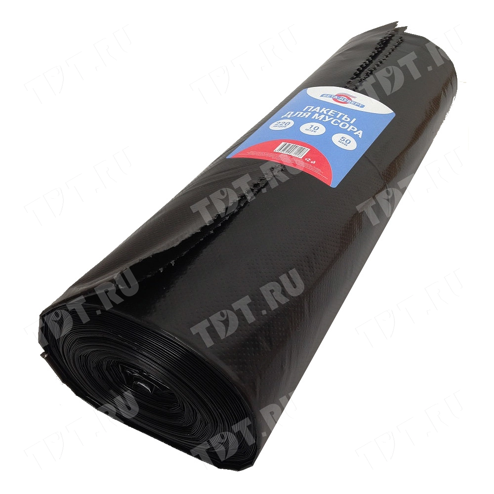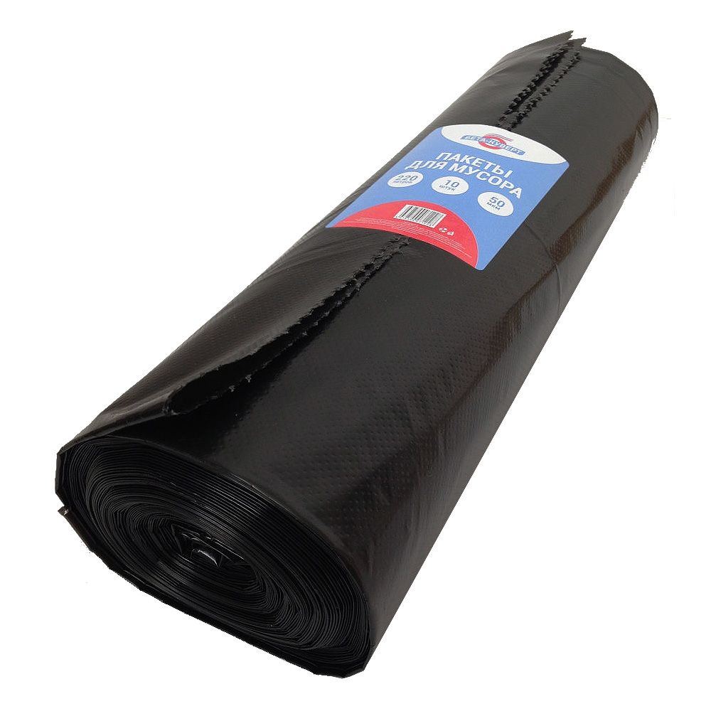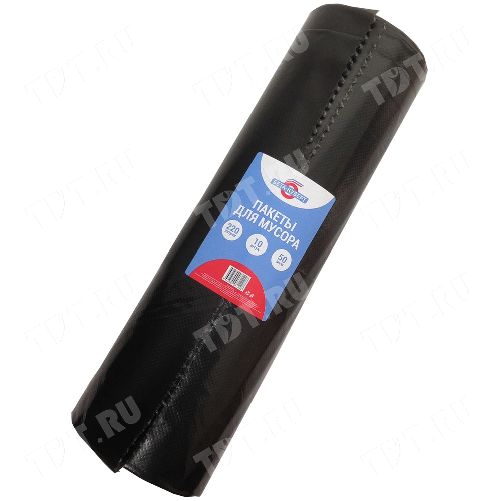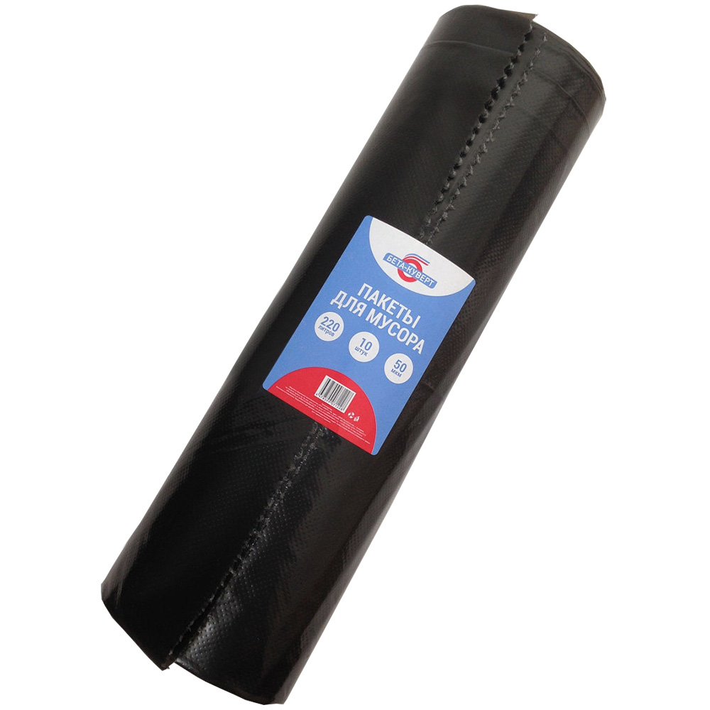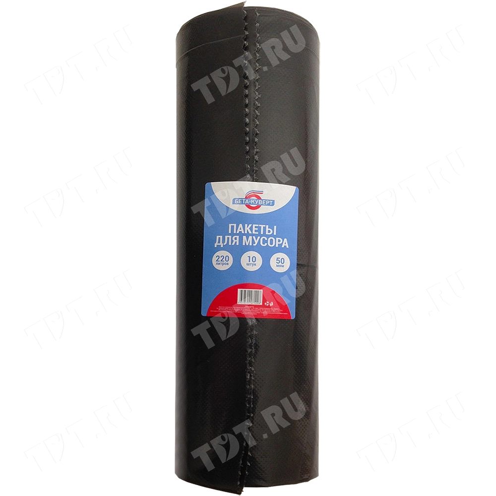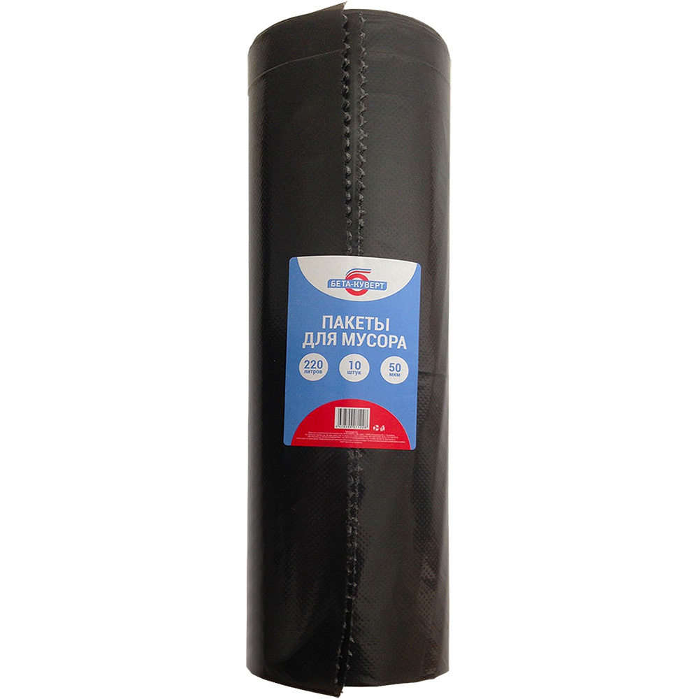Пакеты для мусора Бета-Куверт повышенной прочности, черного цвета, объемом 220 л, длиной 130 см, шириной 90 см, толщиной 50 мкм, в упаковке по 10 штук. Изготовлены из полиэтилена среднего давления (ПСД). Производятся в России.