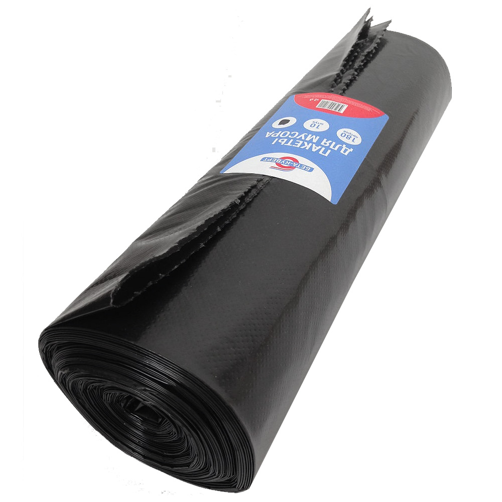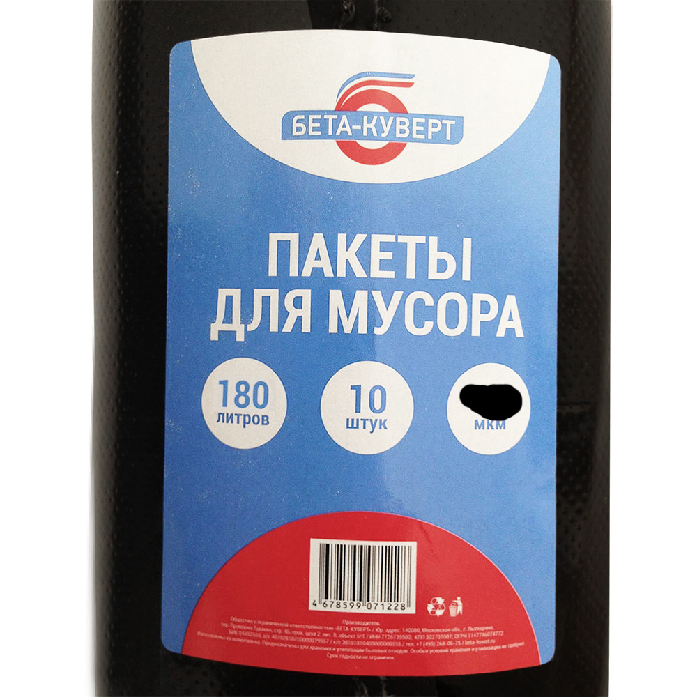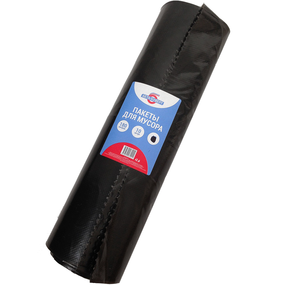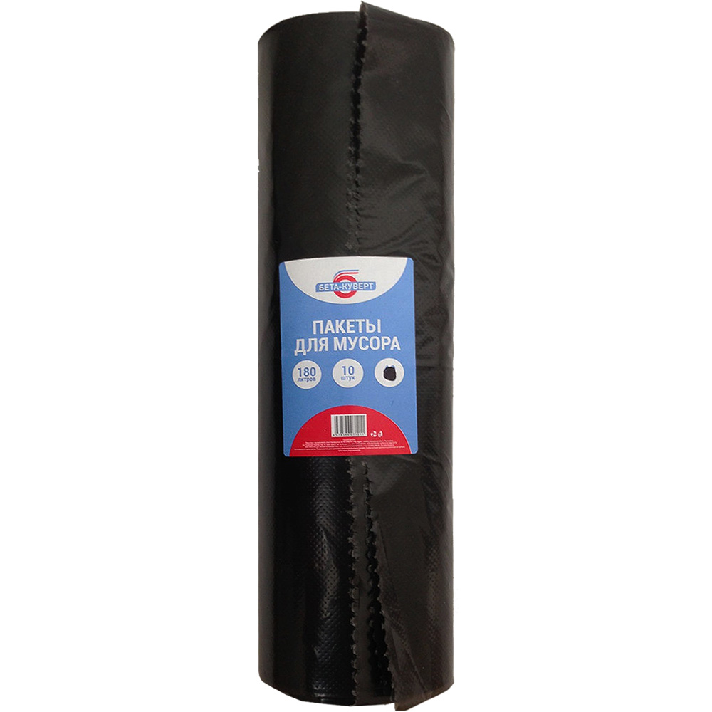 Пакеты для мусора Бета-Куверт повышенной прочности, черного цвета, объемом 180 л, длиной 110 см, шириной 90 см, толщиной 50 мкм, в упаковке по 10 штук. Изготовлены из полиэтилена среднего давления (ПСД). Производятся в России.