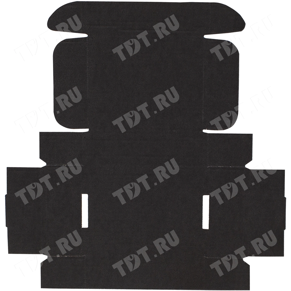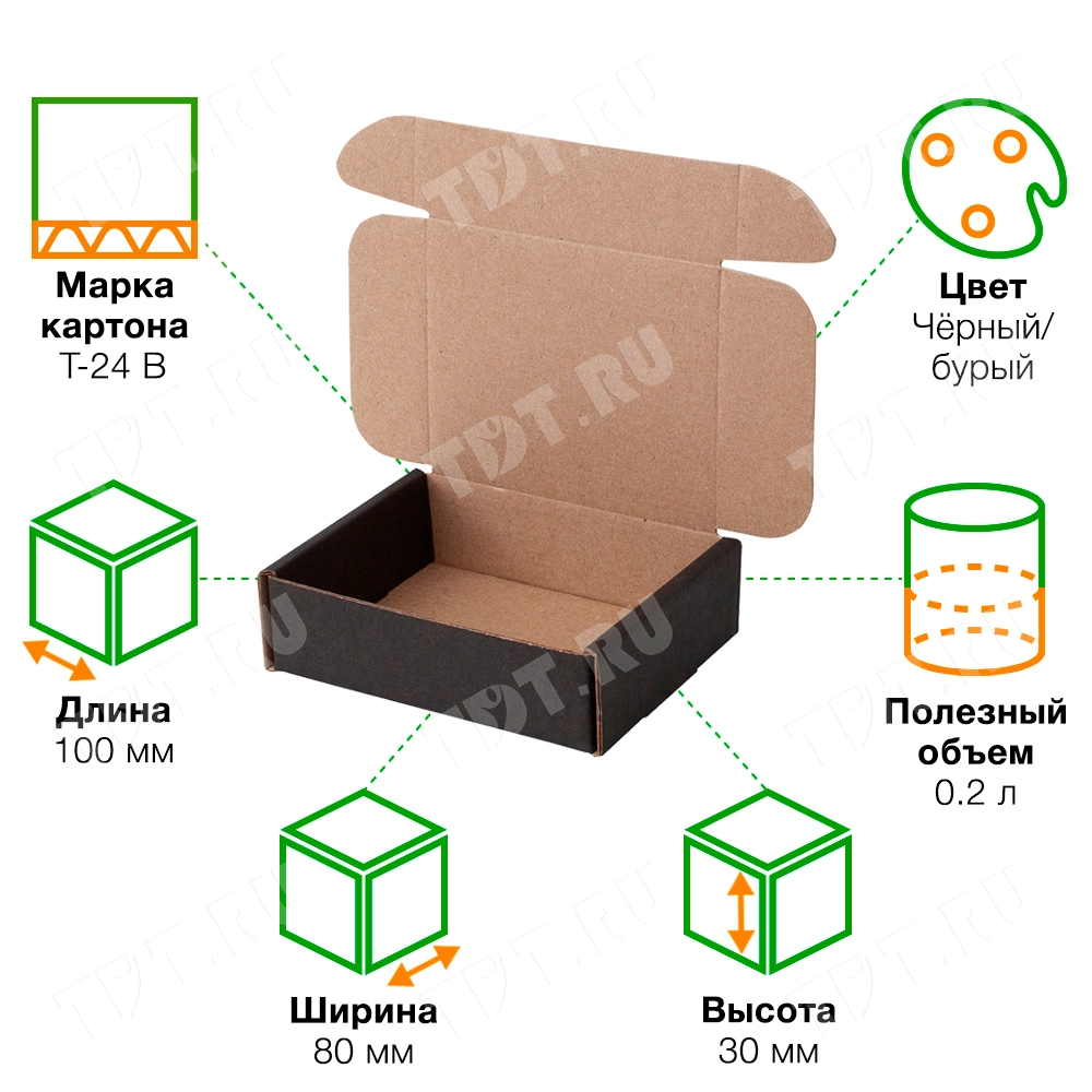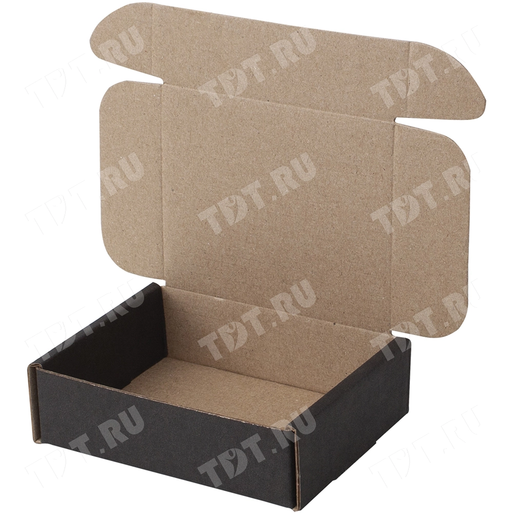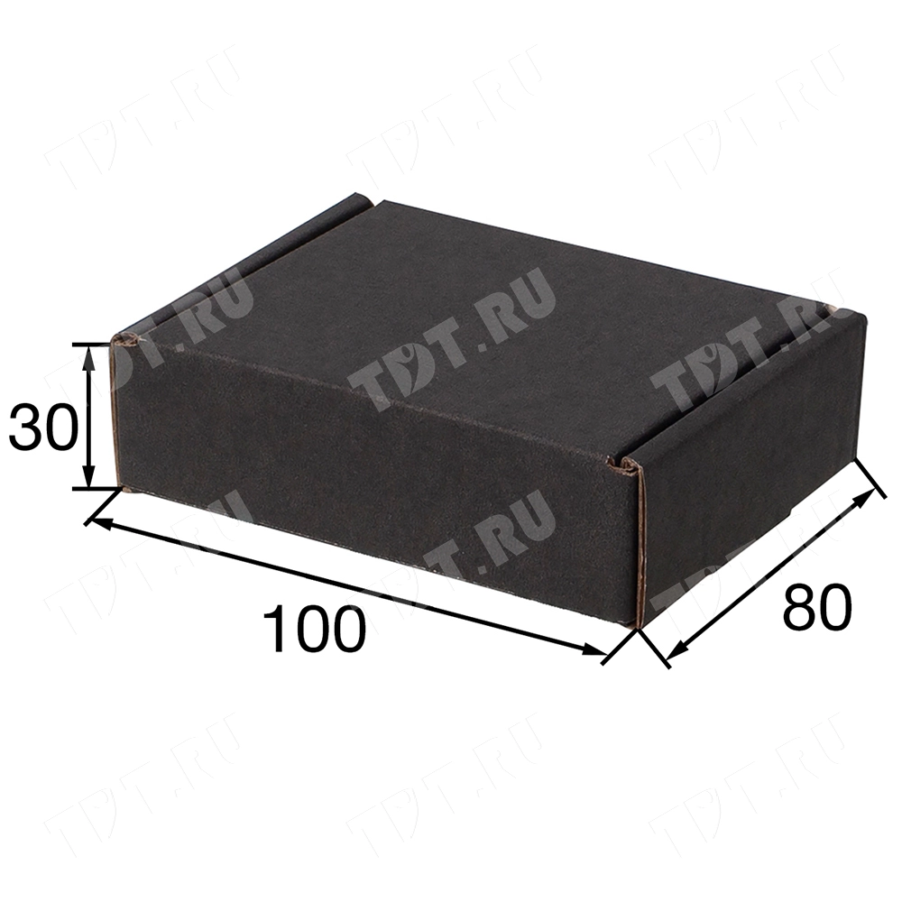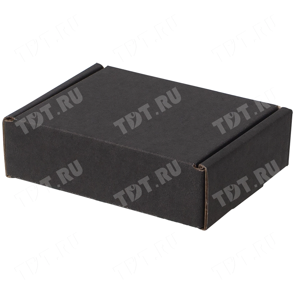 Короб КС-504 МГФ, серии КС-500, чёрный, длиной 100 мм, шириной 80 мм и высотой 30 мм. Изготовлен из картона марки Т-24 В. Полезный объём — 0.2 л.
