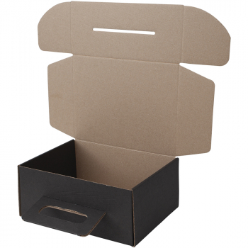 Короб КС-518 МГФ с картонной ручкой, чёрный, серии КС-500, длиной 225 мм, шириной 170 мм и высотой 100 мм. Изготовлен из картона марки Т-24 В. Полезный объём — 3.8 л.