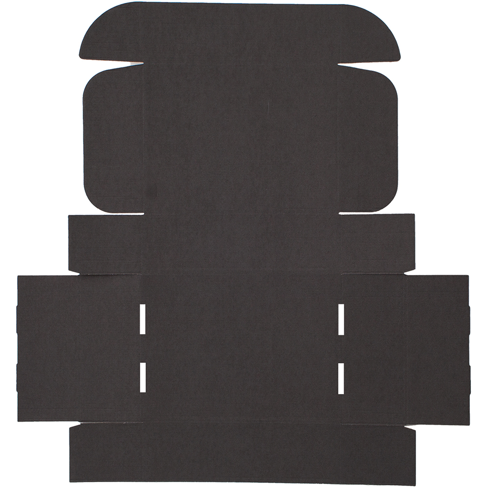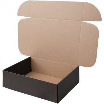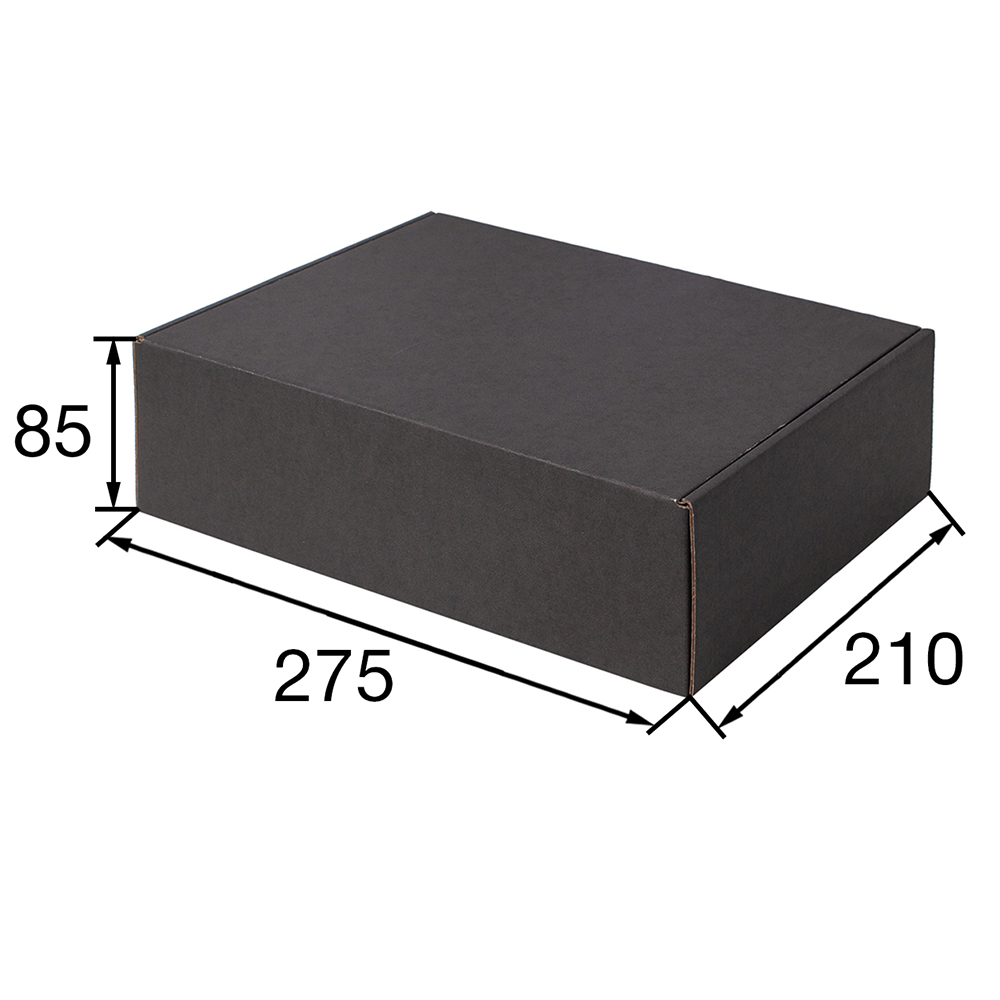 Короб КС-531 МГФ, серии КС-500, чёрный, длиной 275 мм, шириной 210 мм и высотой 85 мм. Изготовлен из микрогофрокартона Т-25. Полезный объём — 4.9 л.