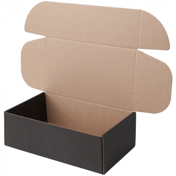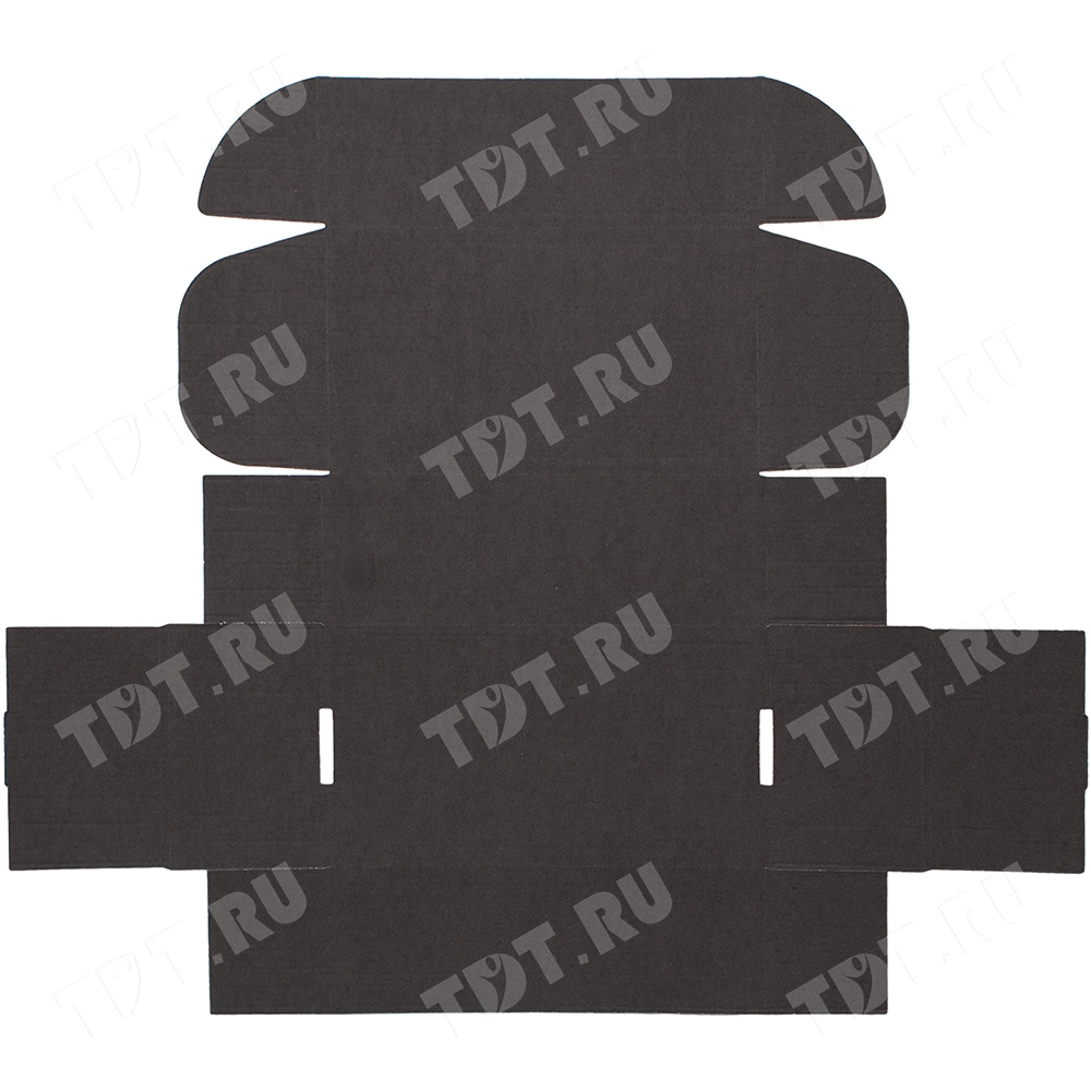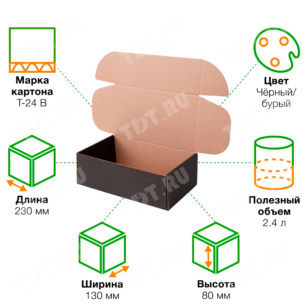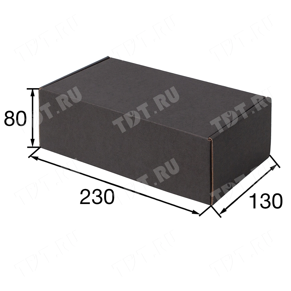 Короб КС-532 МГФ, серии КС-500, чёрный, длиной 230 мм, шириной 130 мм и высотой 80 мм. Изготовлен из картона марки Т-24 В. Полезный объём — 2.4 л.