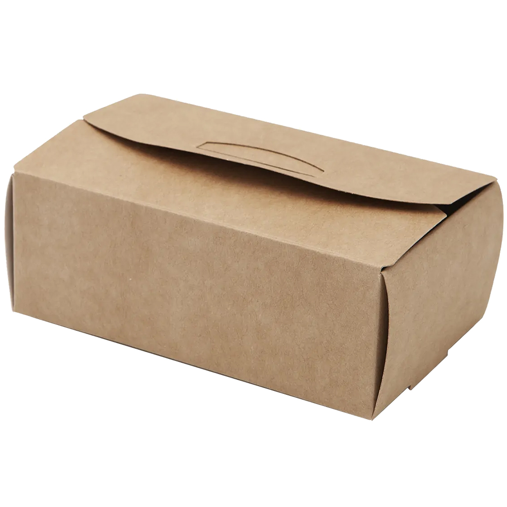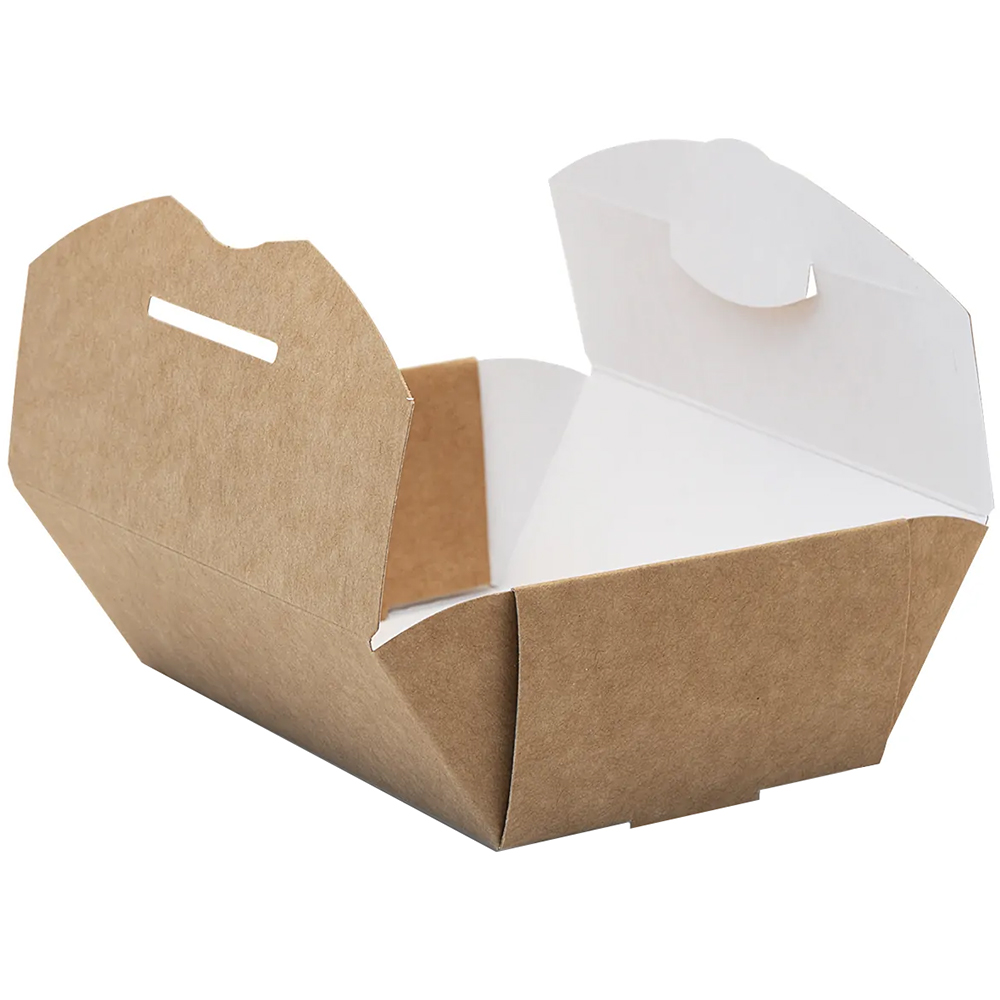 Коробки для наггетсов slide aside, прямоугольные, размер M, бурого и белого цвета, длиной 115 мм, шириной 75 мм, высотой 45 мм, в упаковке по 100 штук. Материал – пищевой картон. Производятся в России.