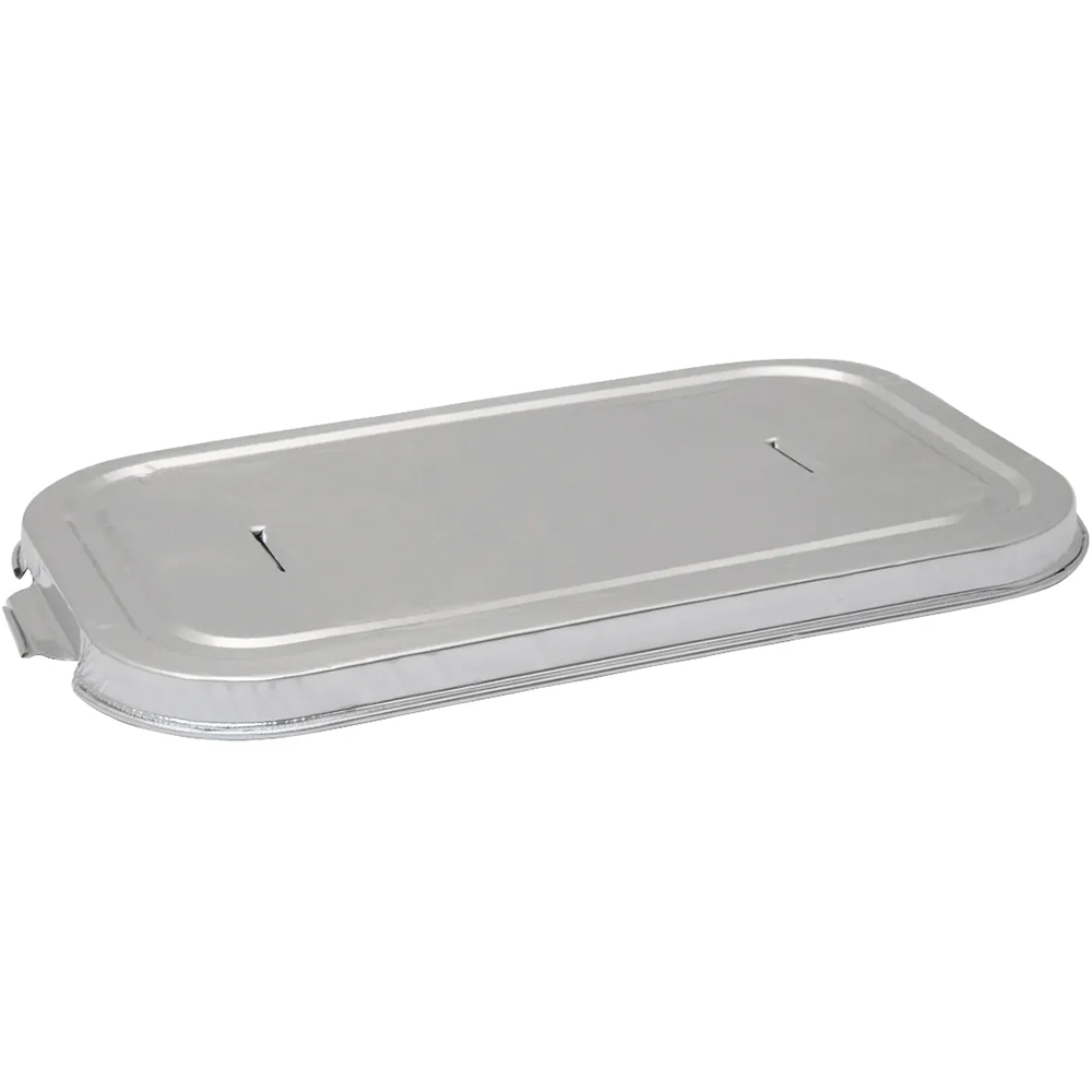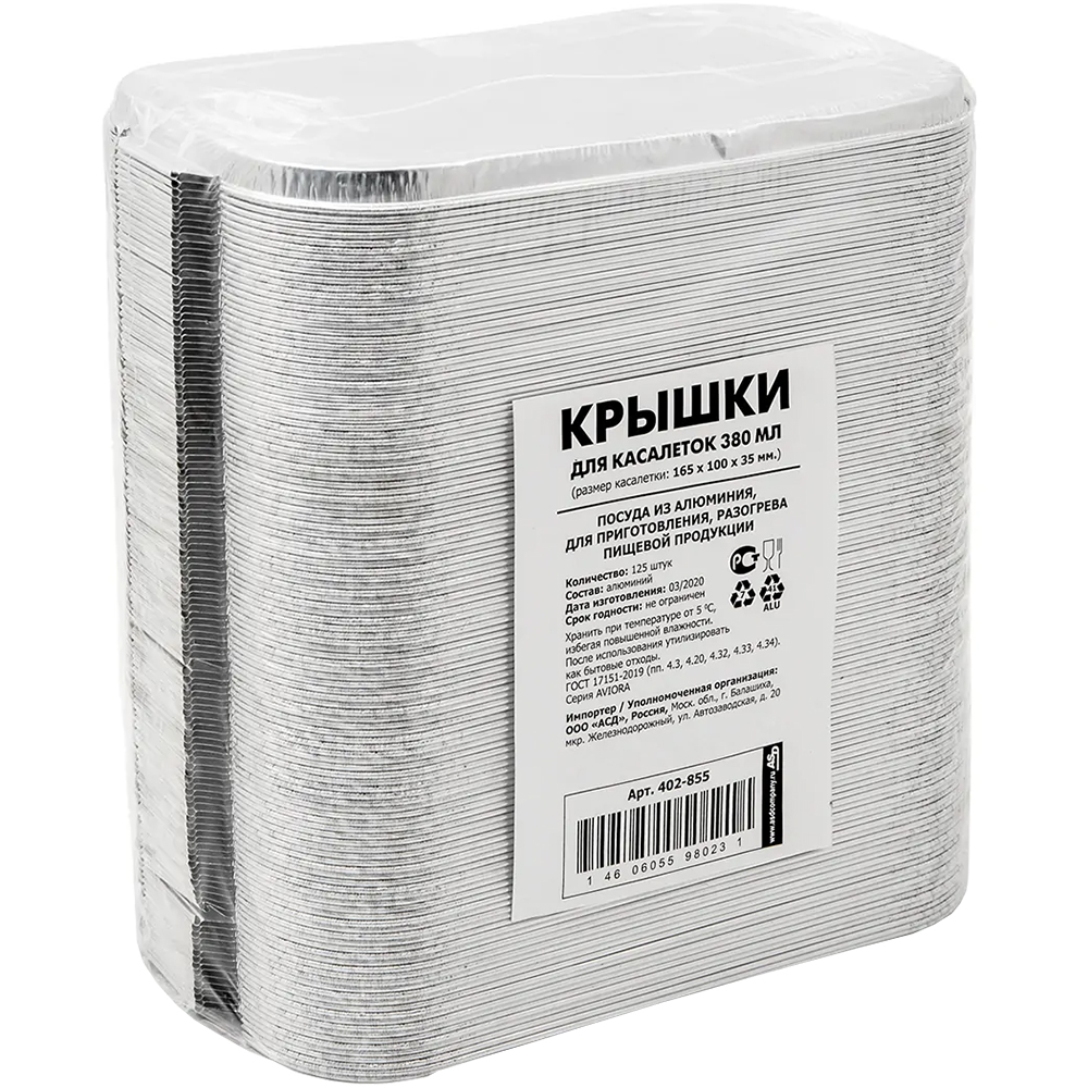 Крышки алюминиевые для алюминиевых форм касалеток 380 мл, прямоугольные, 9603719, длиной 16.5 см, шириной 10 см, в упаковке по 125 штук. Производятся в России.