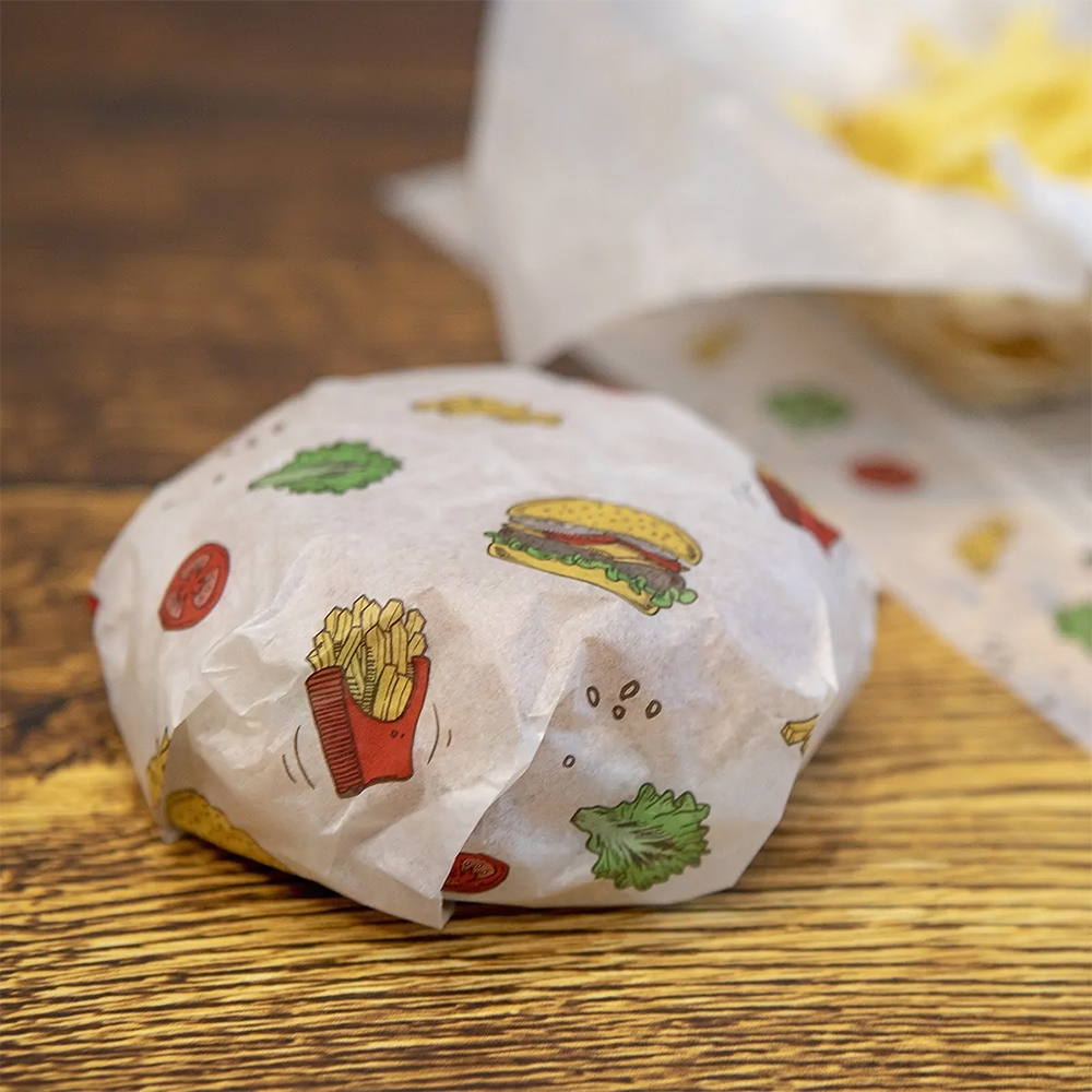 Жиростойкая и влагозащитная оберточная бумага с парафином «Гамбургер» с рисунком, белого цвета, квадратная, длиной 305 мм, шириной 305 мм, в упаковке по 500 шт. Материал – пищевая бумага и парафин.