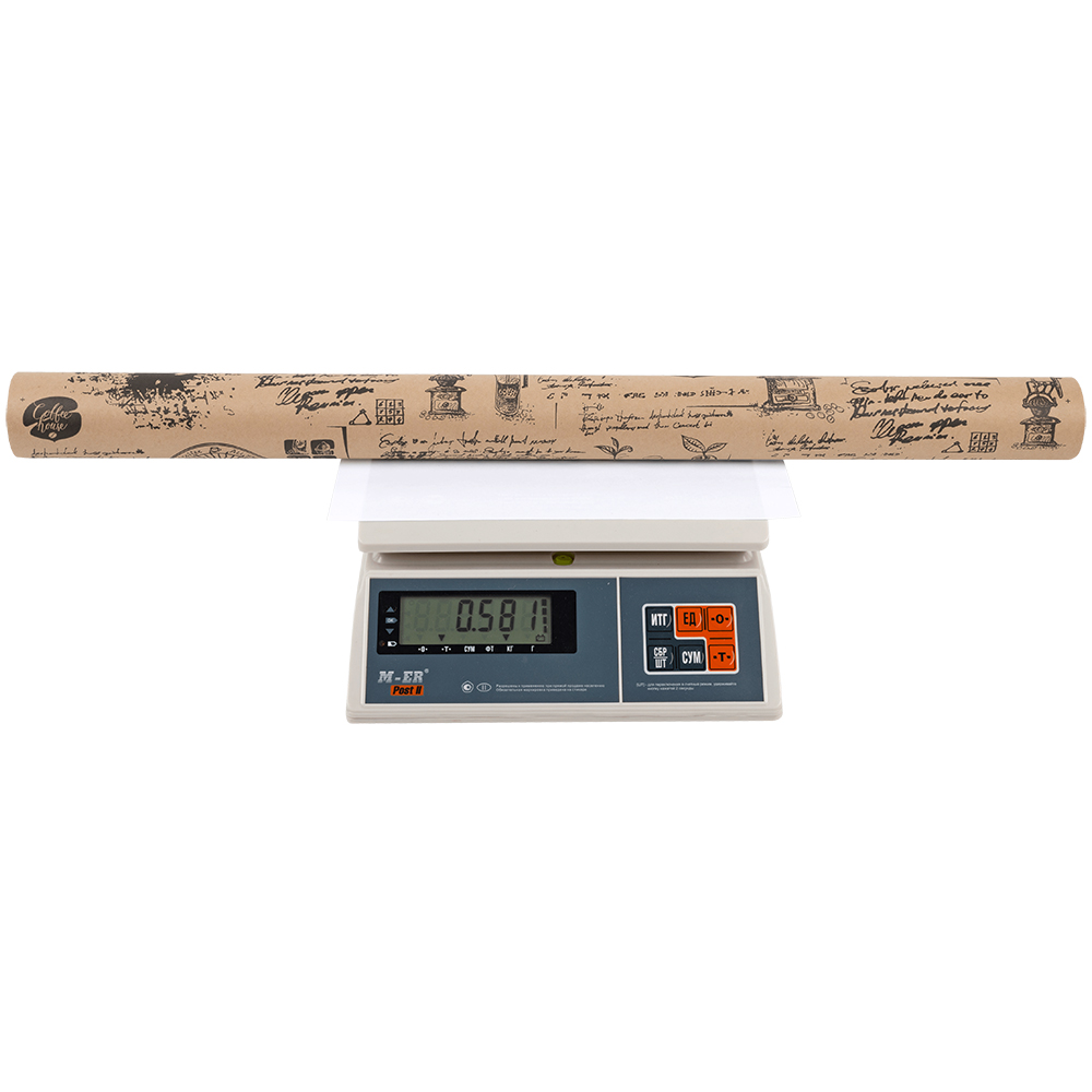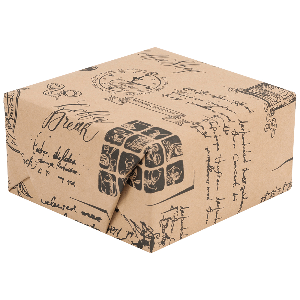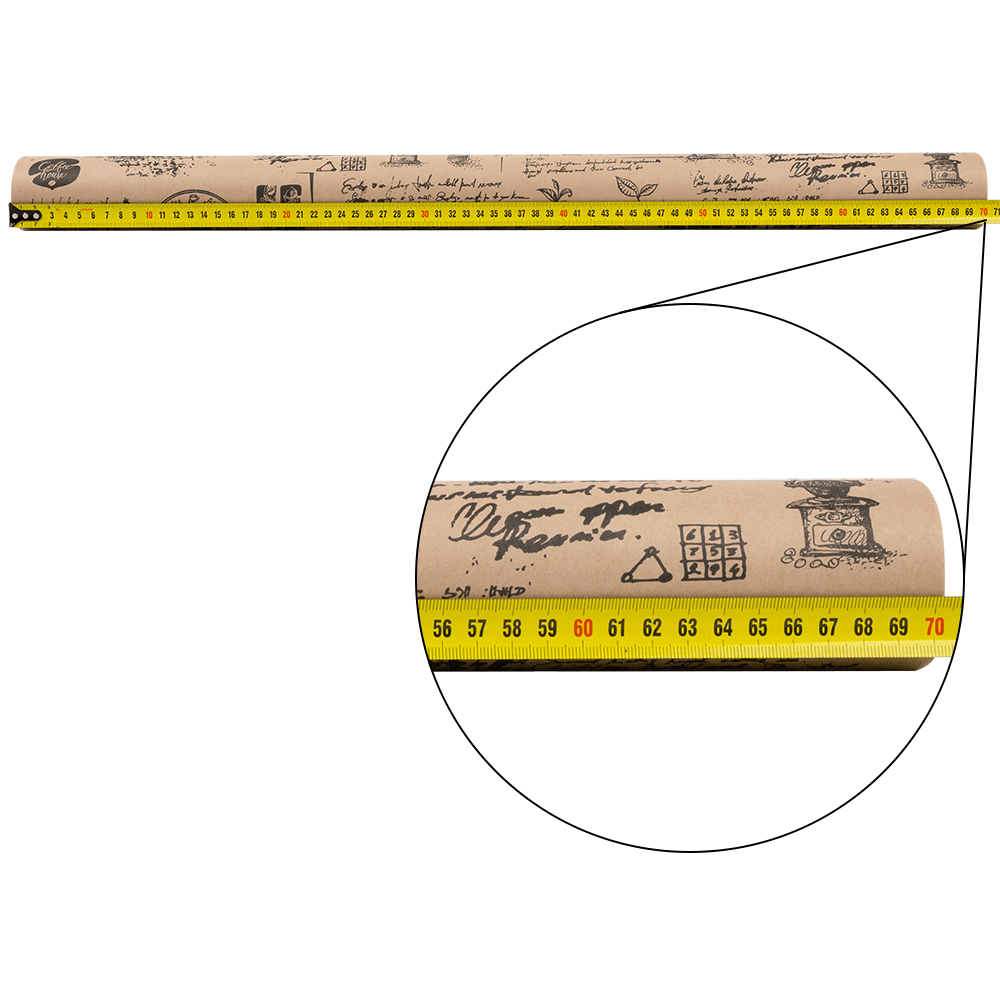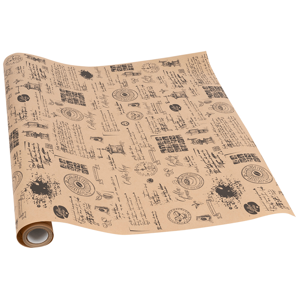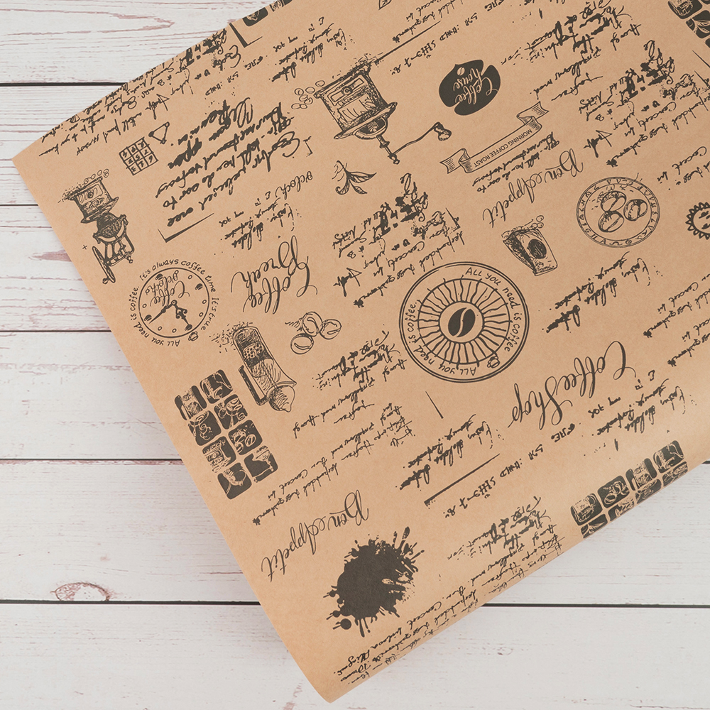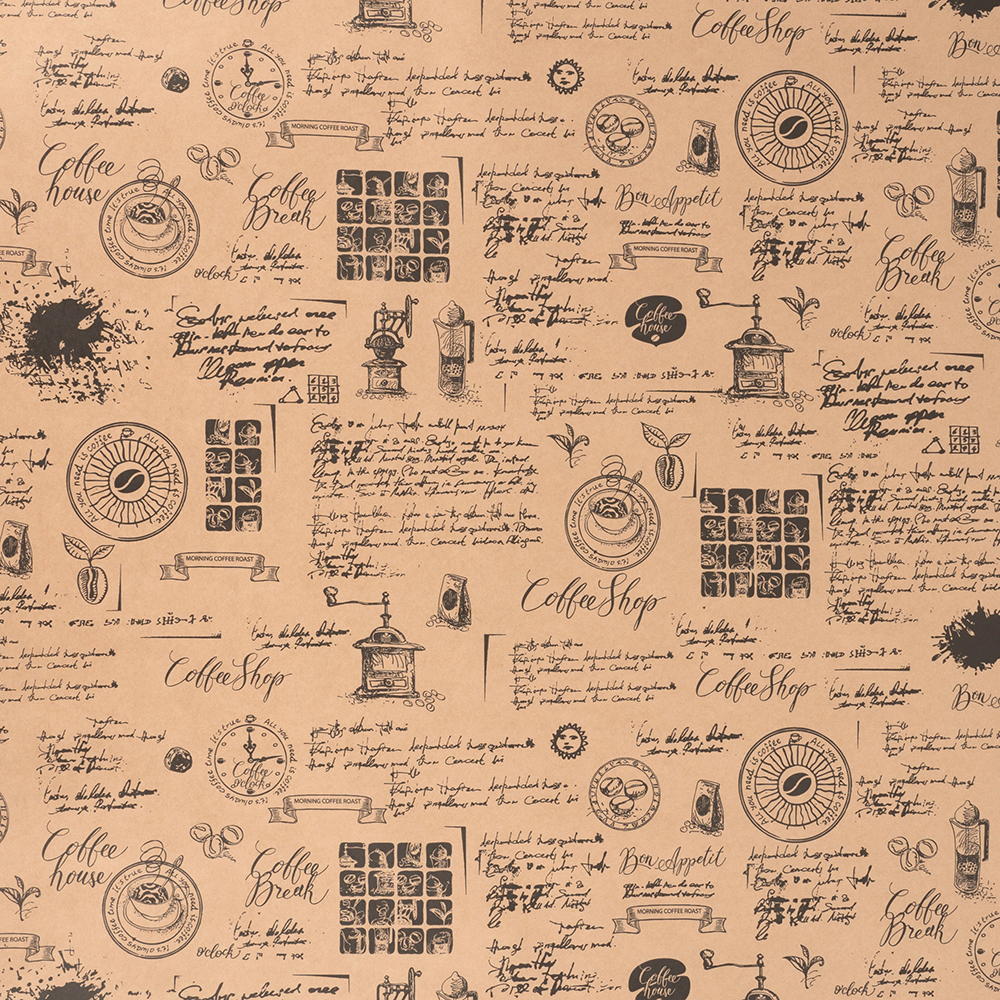 Оберточная крафт бумага с рисунком в рулоне «Кофе», с черным принтом, шириной 70 см, намоткой 10 м, плотностью 70 г/м². Производится в России.