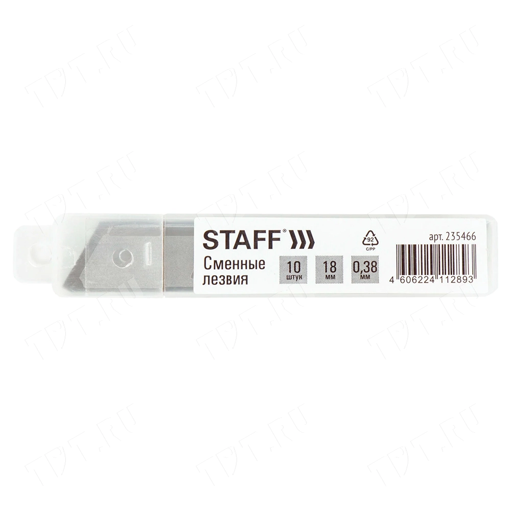 Набор сменных лезвий STAFF в пластиковом боксе, код производителя 235466, шириной 18 мм, толщиной 0.38 мм, в упаковке по 10 штук. Форма лезвия – параллелограмм. Материал лезвия – углеродистая сталь. Производятся в Китае.