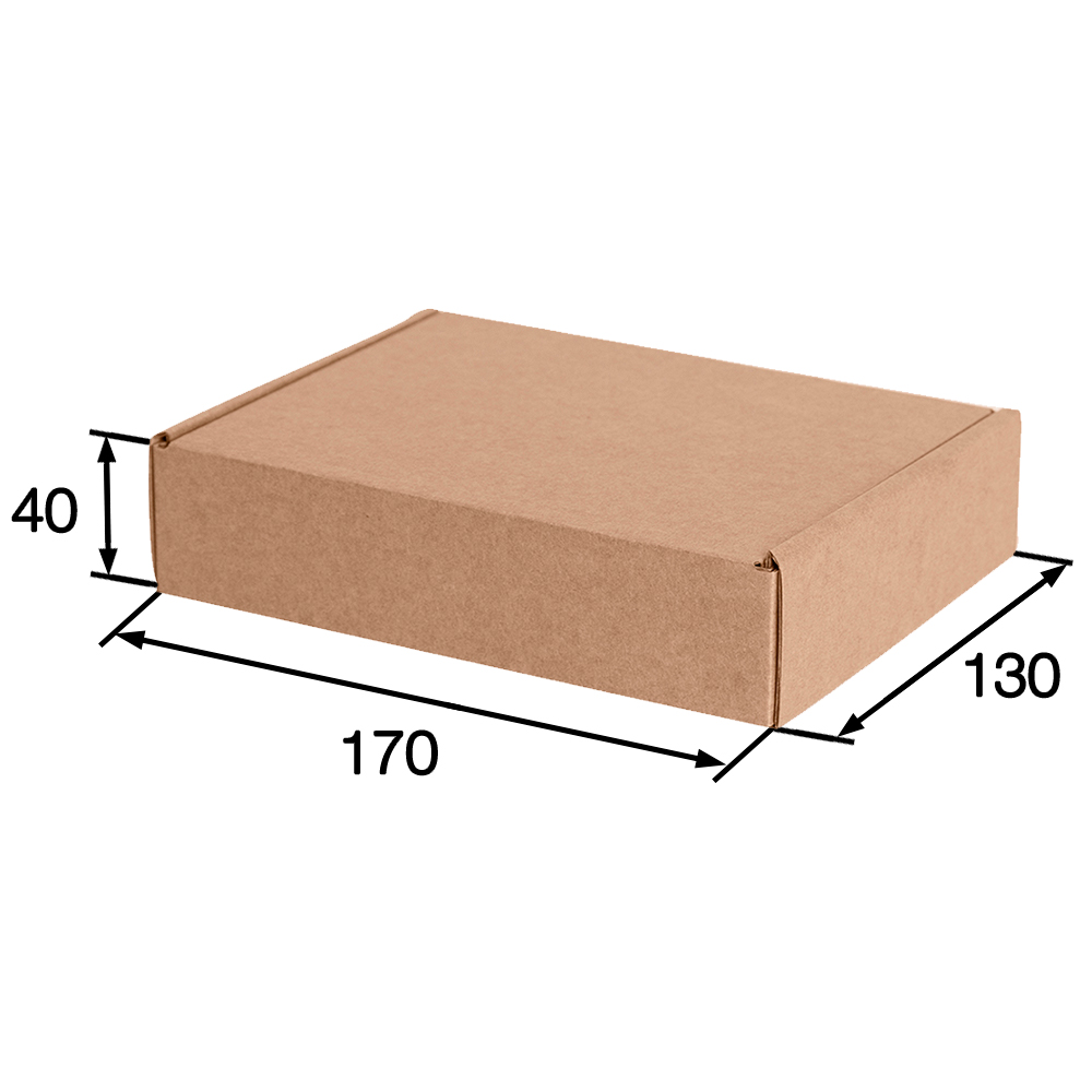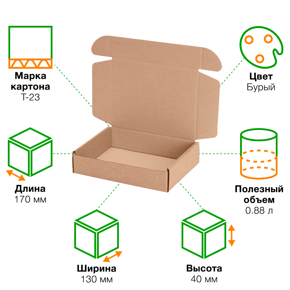 Короб КС-600 МГК, серии КС-600, бурый, длиной 170 мм, шириной 130 мм и высотой 40 мм. Изготовлен из микрогофрокартона Т-23. Полезный объём — 0.88 л.